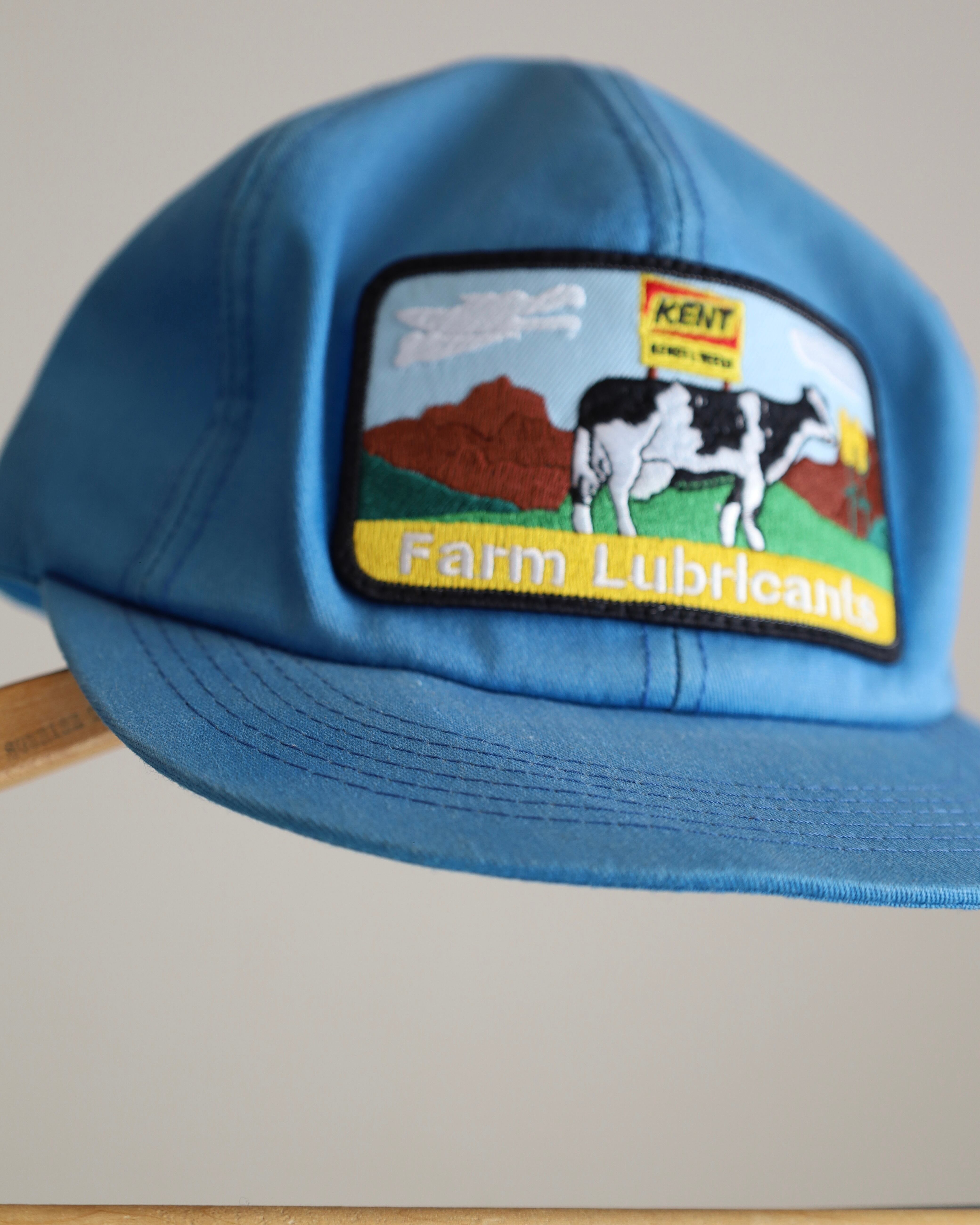 牧場風景と乳牛、そして「Farm Lubricants(農業用潤滑油)」の刺繍が入った、渋めの企業ノベルティデザイン