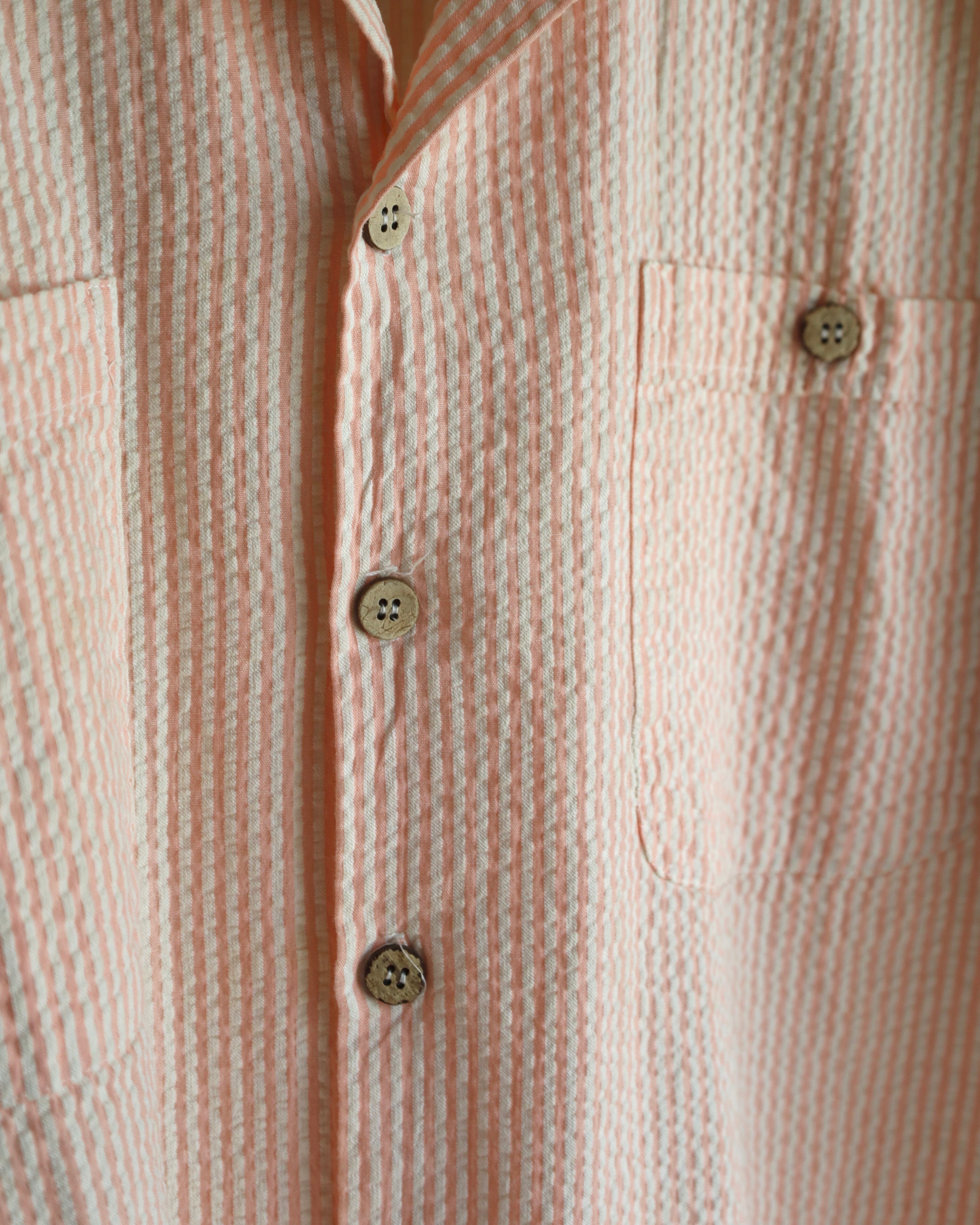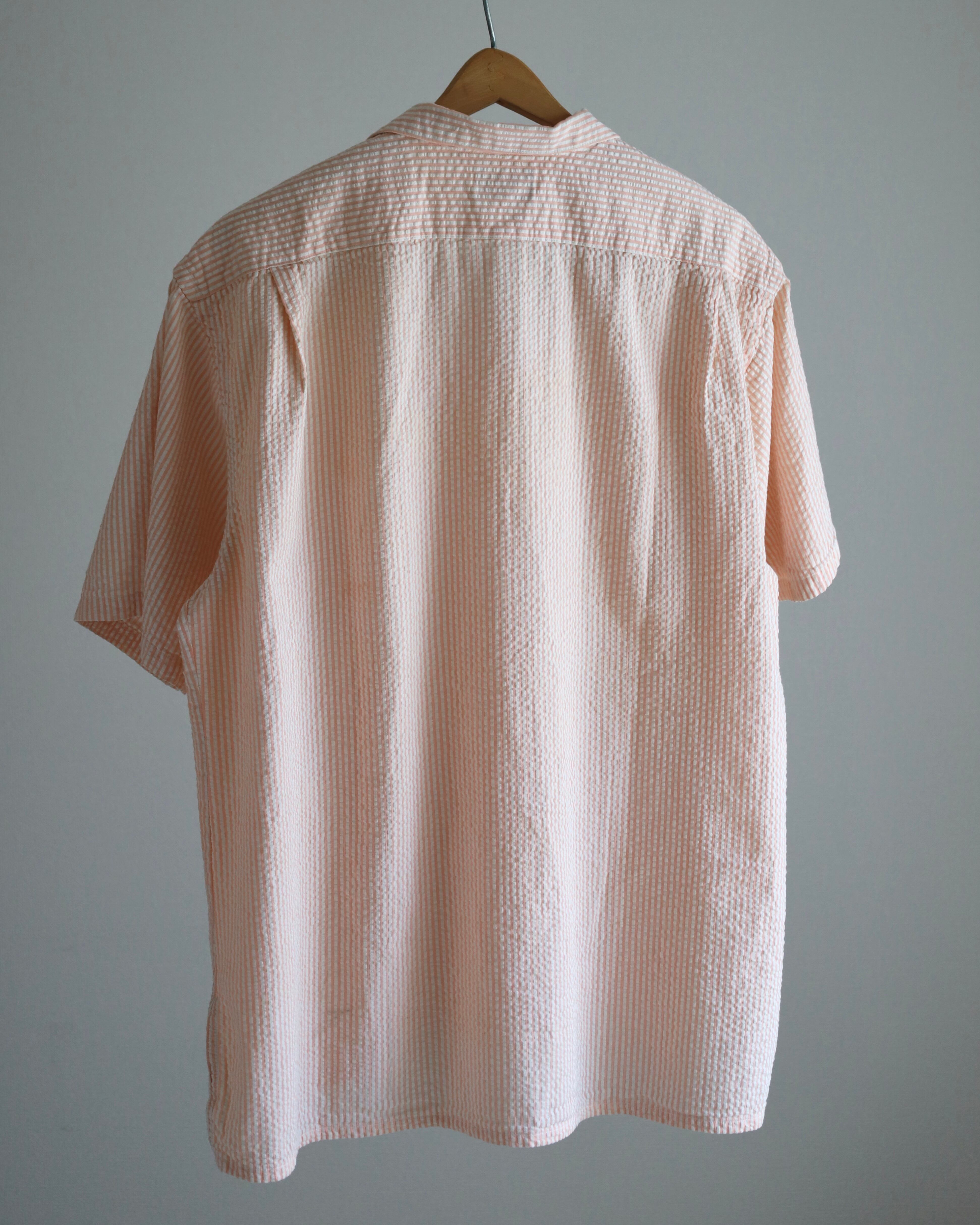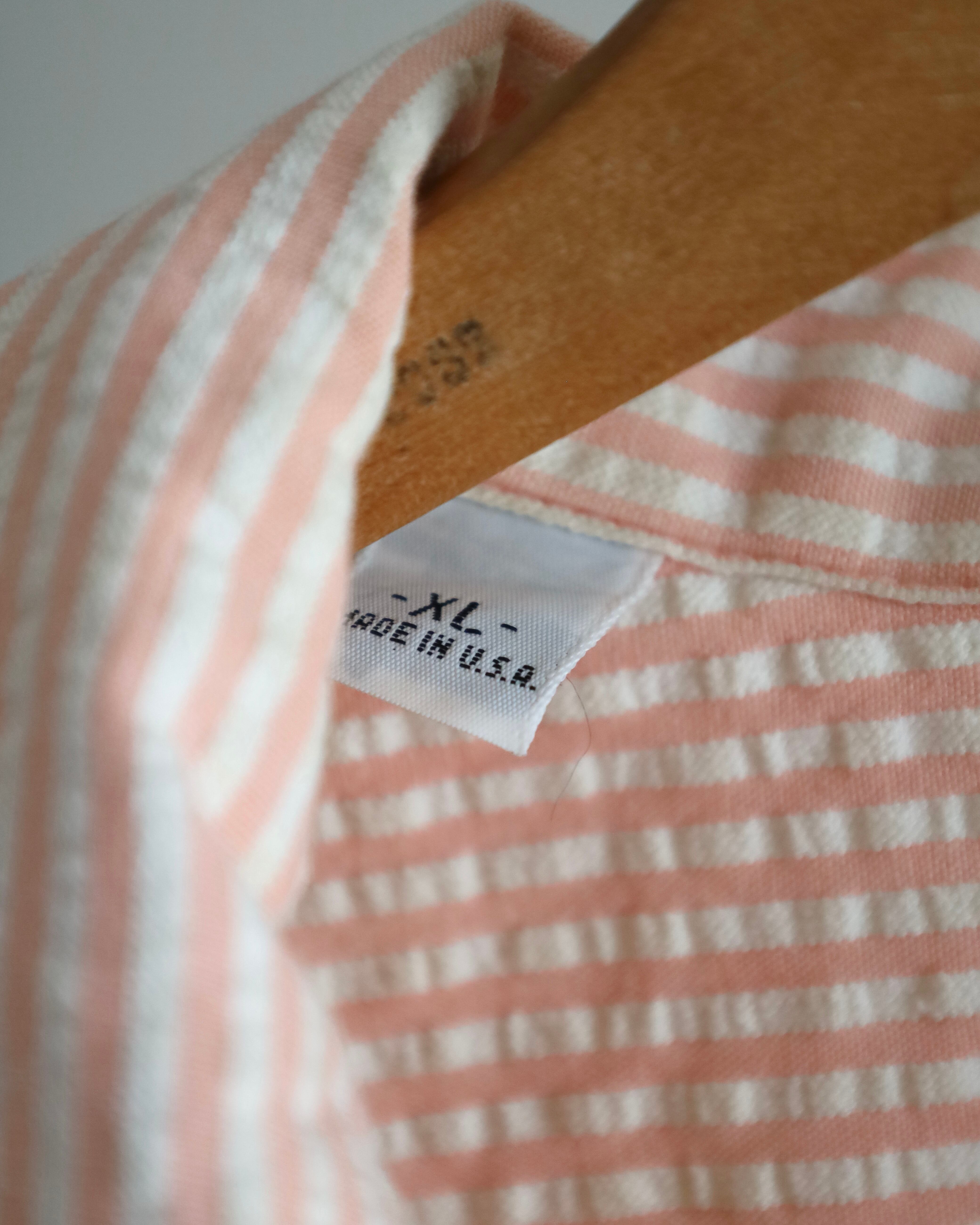 涼しげなシアサッカー生地を使用した、James River Traders製 Made in USA のオープンカラーシャツ。ピンク×ホワイトのストライプが春夏らしい爽やかな印象を与える一枚です。フロントはボックスシルエットに加え、ダブルポケット仕様で実用性も高いデザイン。シングルニードル仕立ての丁寧な縫製も特徴で、80年代らしいリゾート感やリラックス感を演出してくれます。ショーツやデニムと合わせてカジュアルに、スラックスと合わせて大人っぽくも着こなせる万能なヴィンテージシャツです。