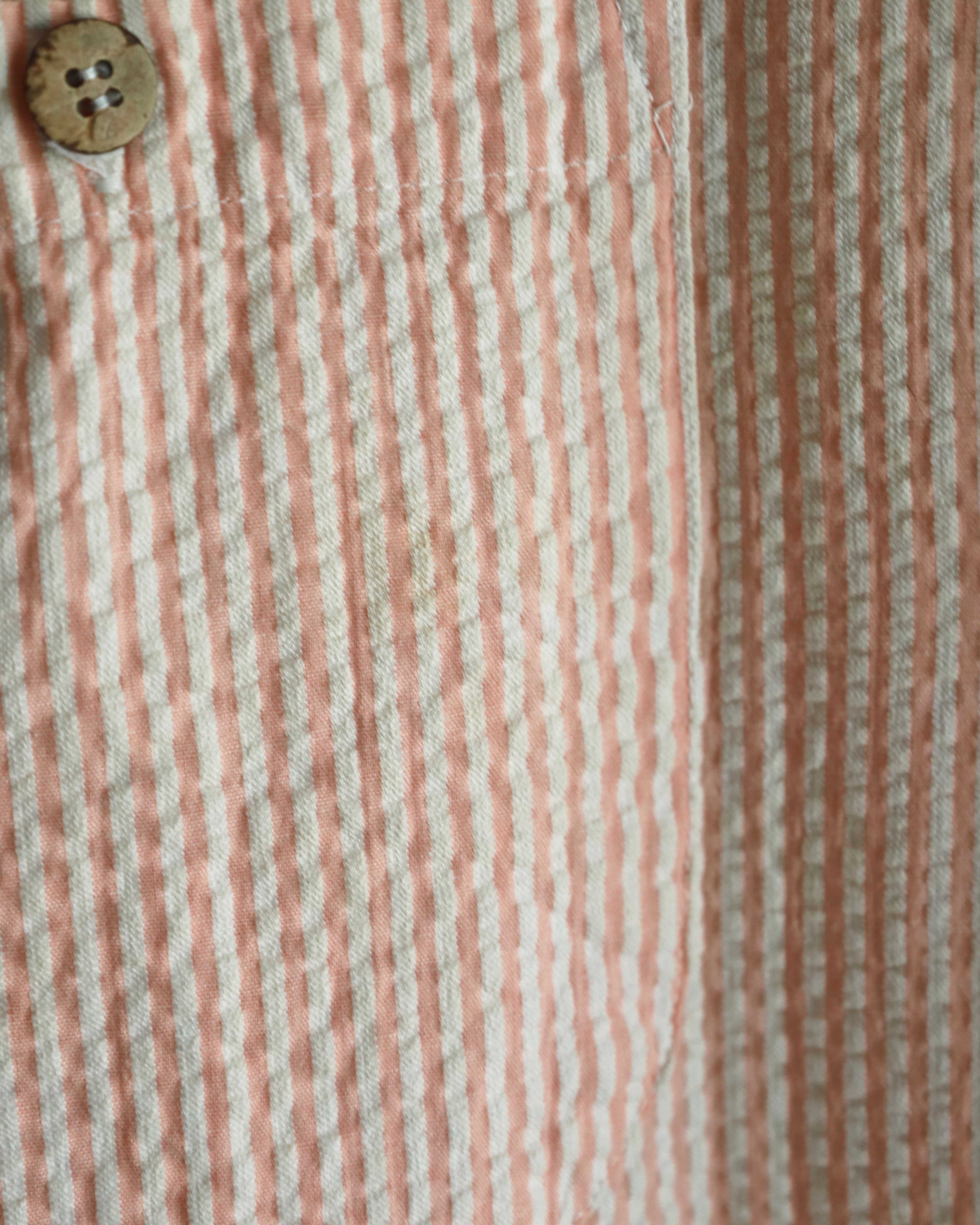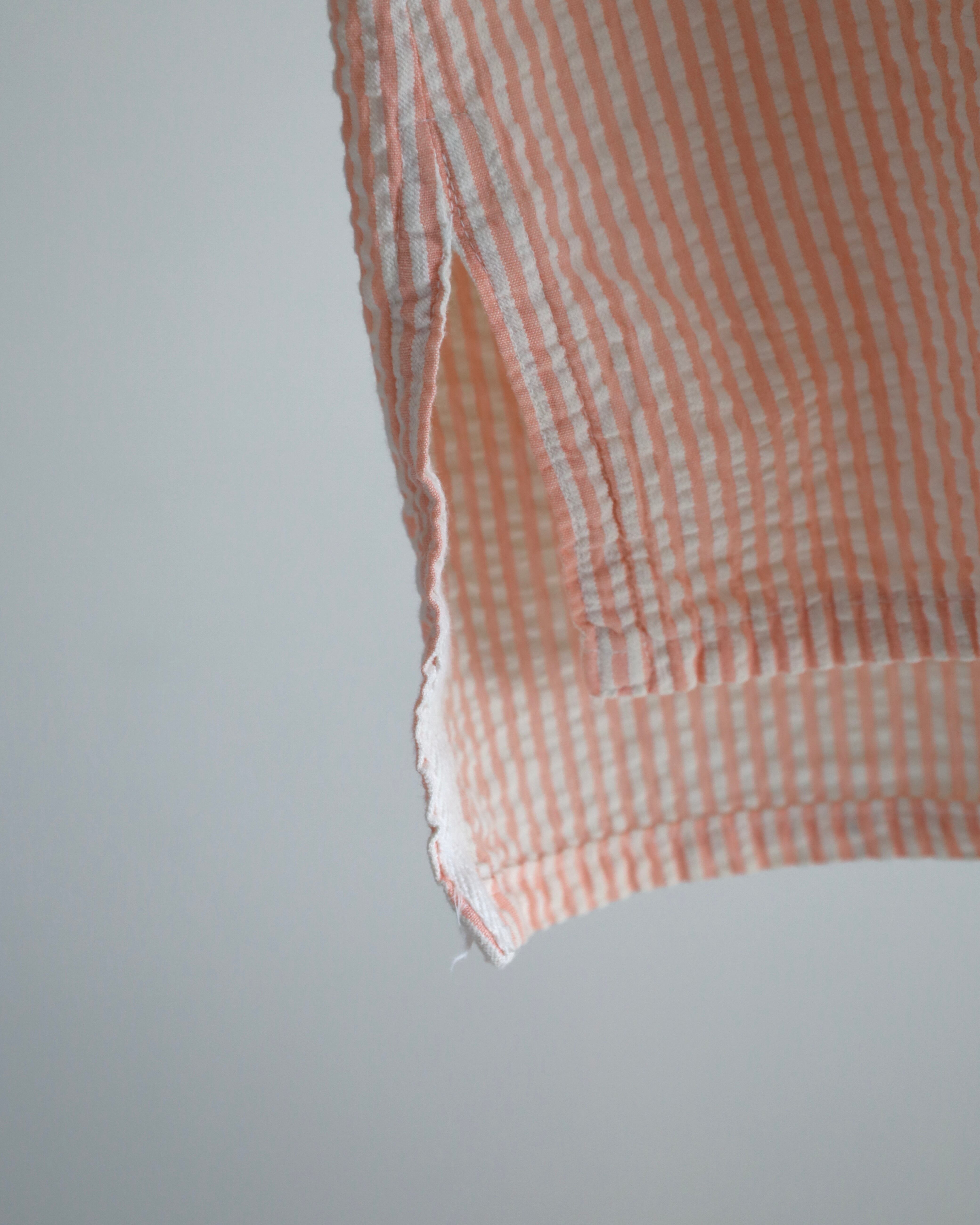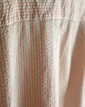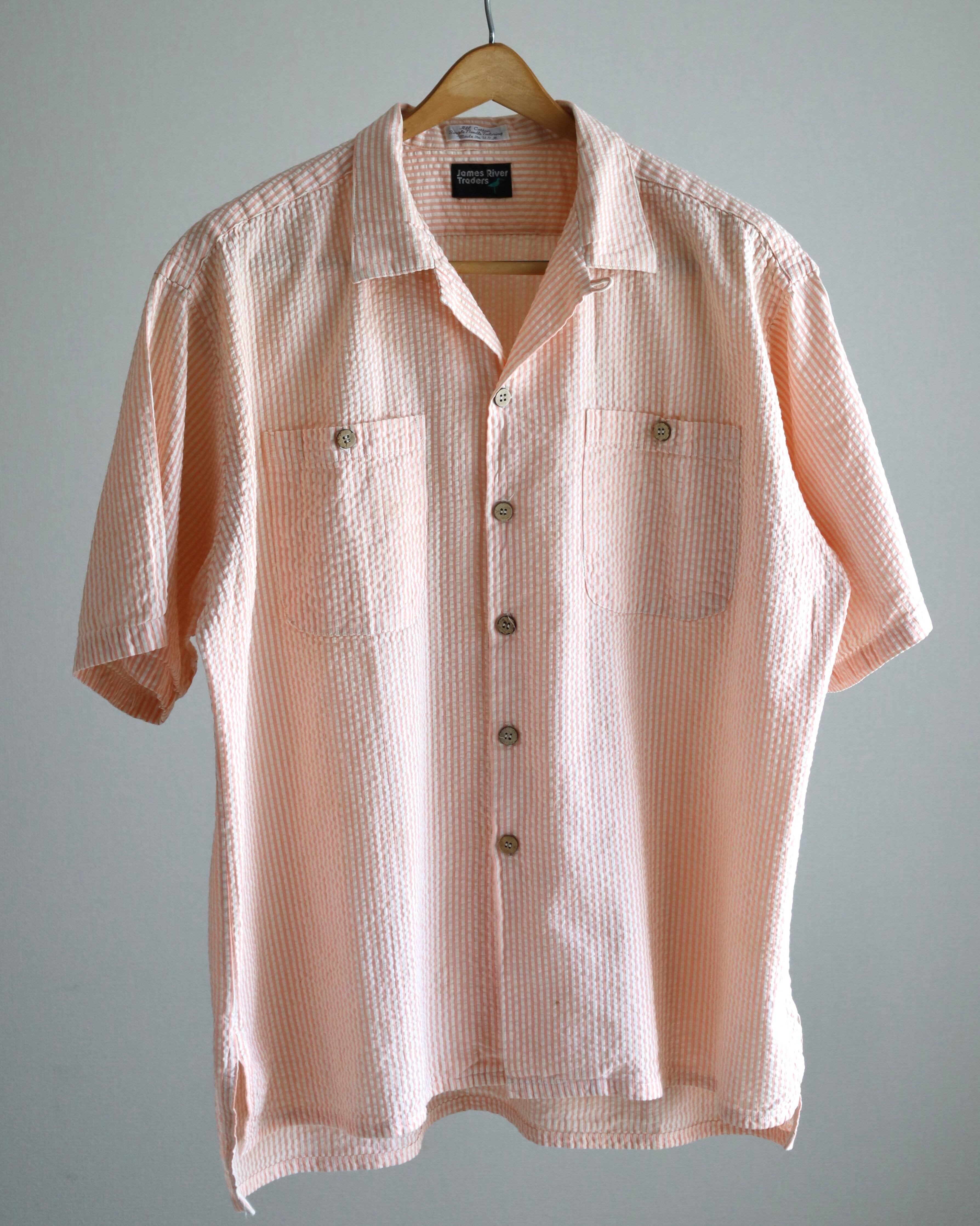 涼しげなシアサッカー生地を使用した、James River Traders製 Made in USA のオープンカラーシャツ。ピンク×ホワイトのストライプが春夏らしい爽やかな印象を与える一枚です。フロントはボックスシルエットに加え、ダブルポケット仕様で実用性も高いデザイン。シングルニードル仕立ての丁寧な縫製も特徴で、80年代らしいリゾート感やリラックス感を演出してくれます。ショーツやデニムと合わせてカジュアルに、スラックスと合わせて大人っぽくも着こなせる万能なヴィンテージシャツです。