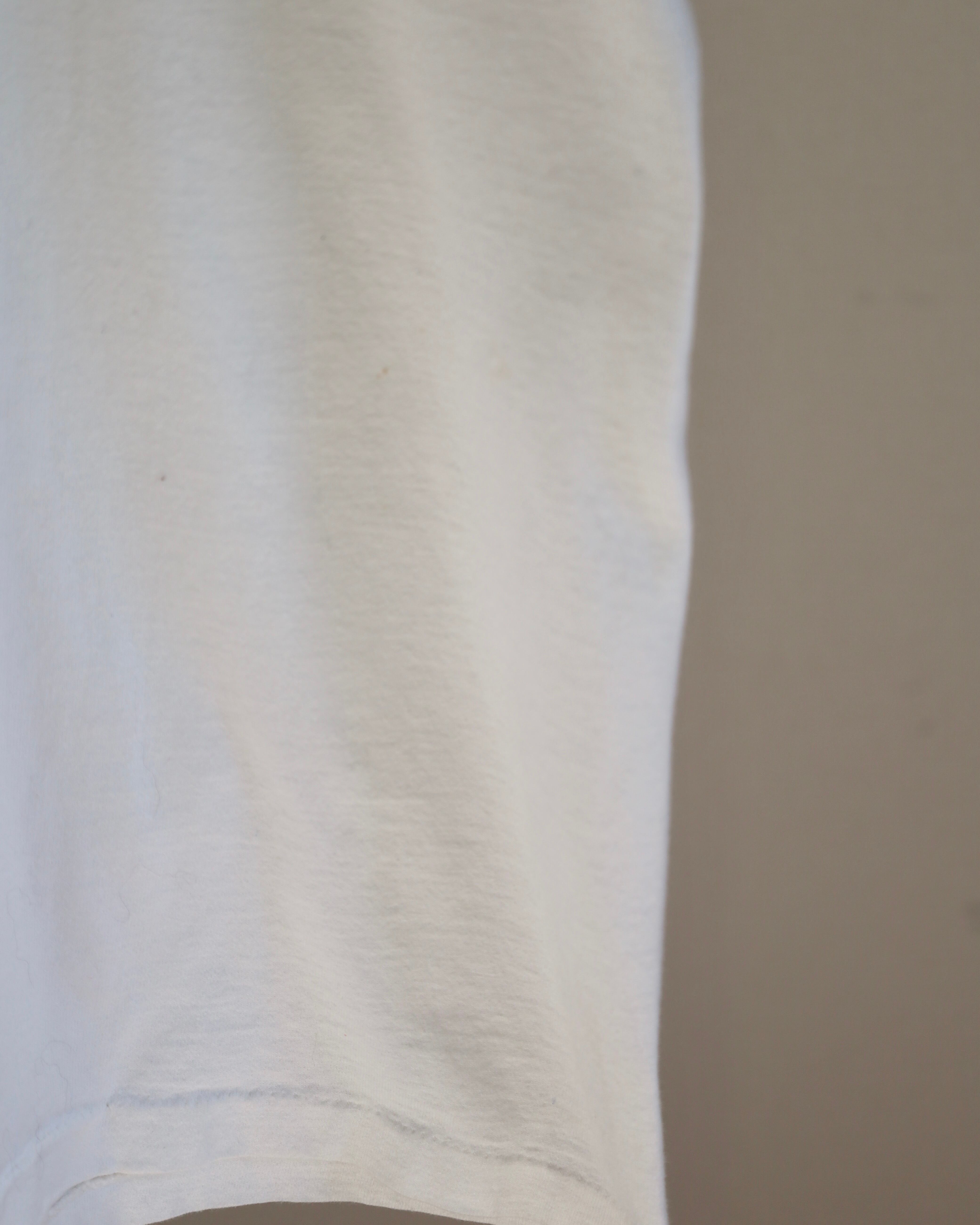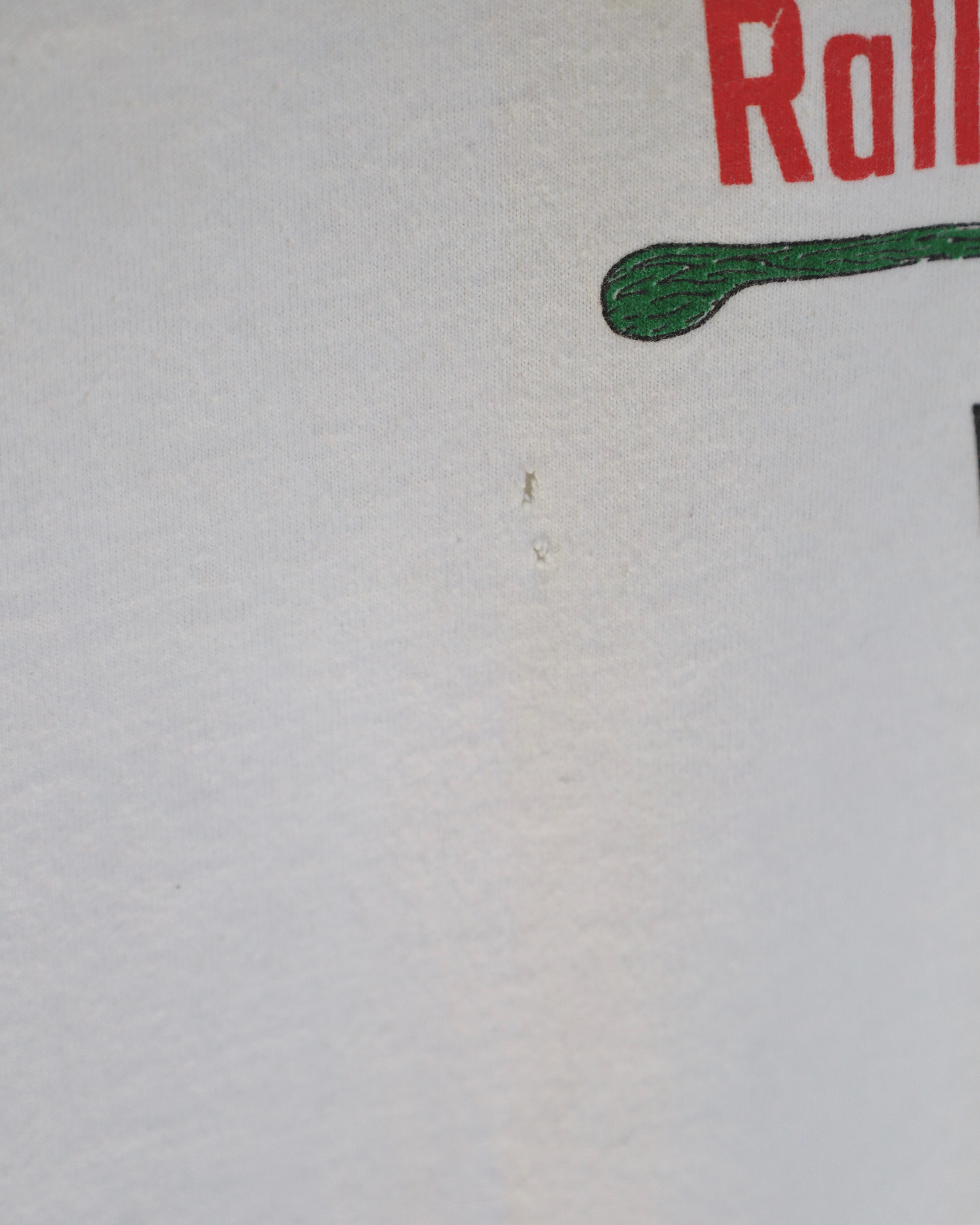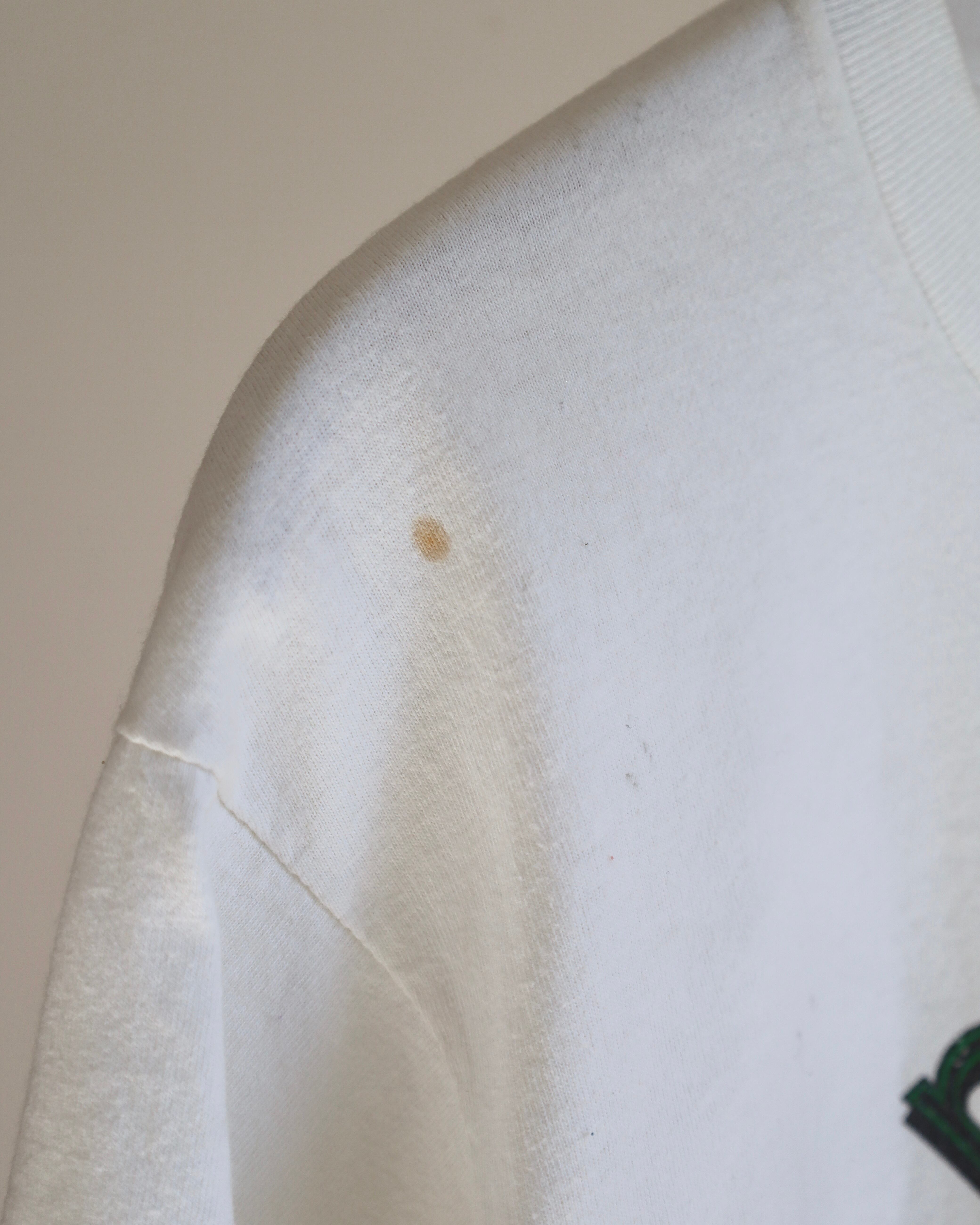 セント・パトリックス・デー(St. Patrick’s Day)はアイルランドの守護聖人を祝う3月17日の祝祭。緑色(シャムロック)を身に着ける“Wearing of the Green”の習わしがあり、米国でもパレードやビールイベントで盛り上がるため、当時のローカルイベントTは人気のテーマです。本作は“Rally in the Alley / Washington, D.C.”のグラフィックで、レプラコーンとビアジョッキのポップなデザイン。軽めで柔らかな80sボディ、袖・裾はシングルステッチ。発色の良いグリーン×イエローが白地に映える一枚です。