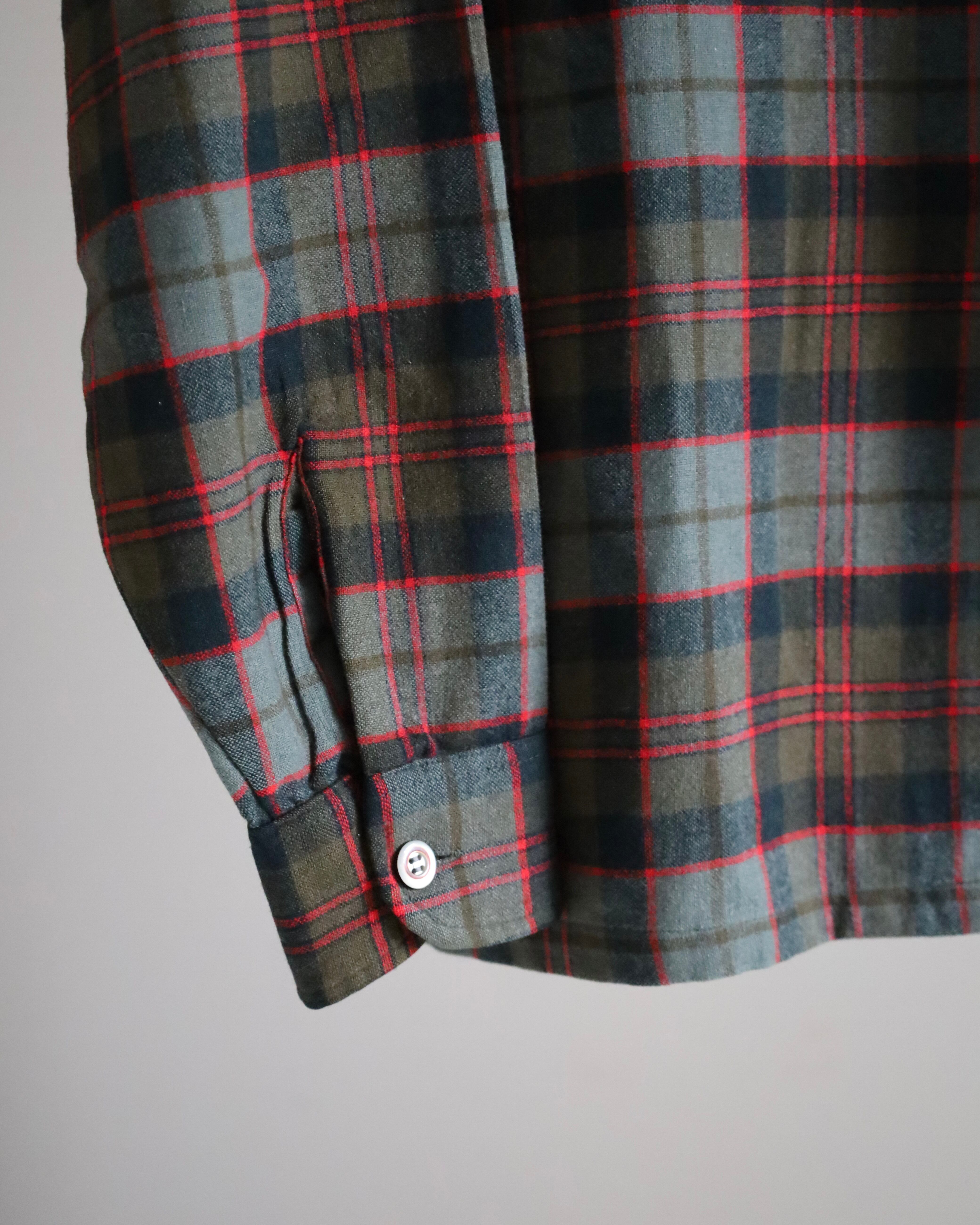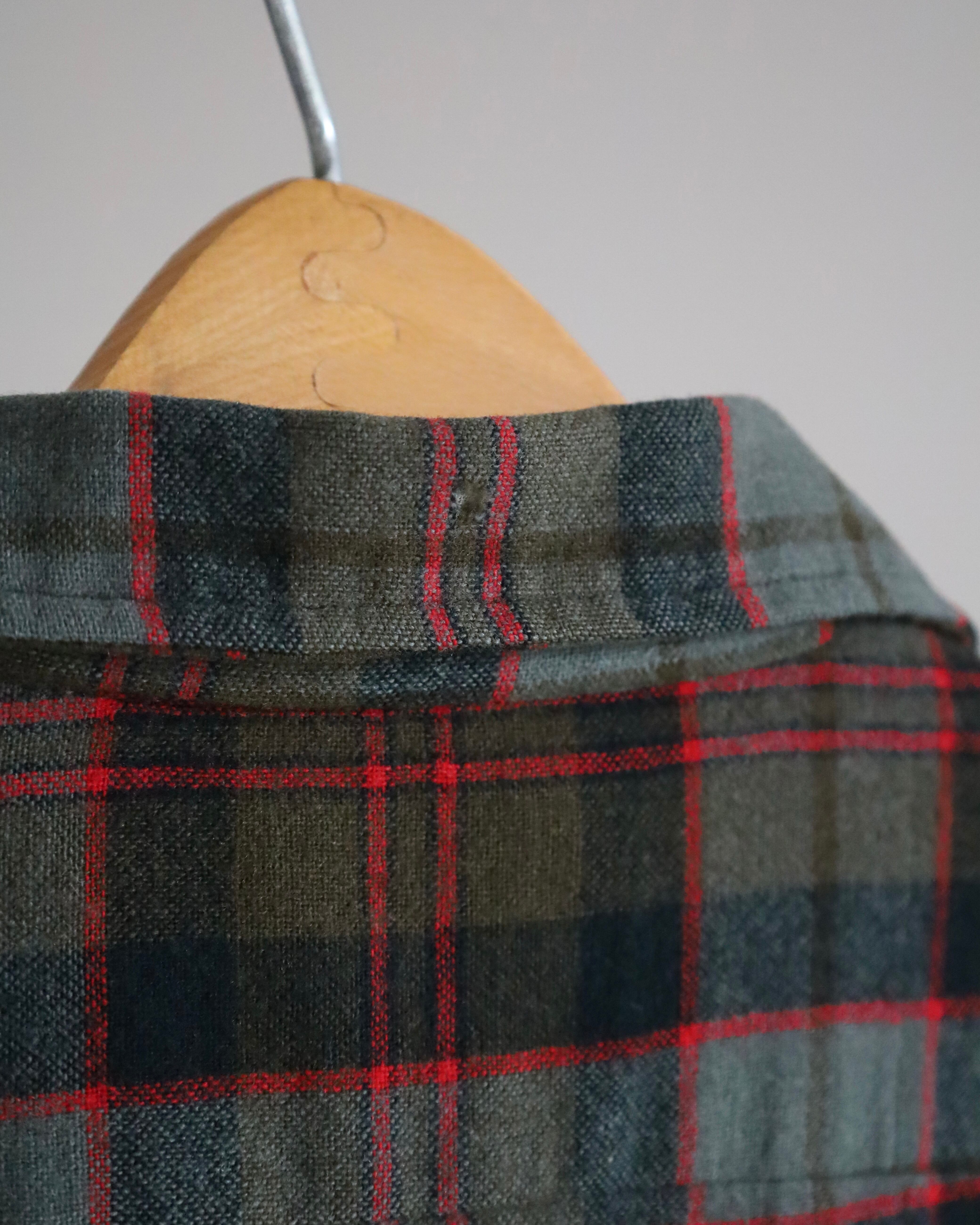 米国製のMcGREGOR“William Tell”ライン。洗濯可能なウール混(GUARANTEED WASHABLE)で、起毛感のあるフランネル地。開襟(オープンカラー)、左胸ポケット、グレー系のオリジナルボタン。深いグリーン×グレーに赤のオーバーチェック(襟裏に“Old Lochaber”のタブ付き)でクラシックな雰囲気の一枚です。