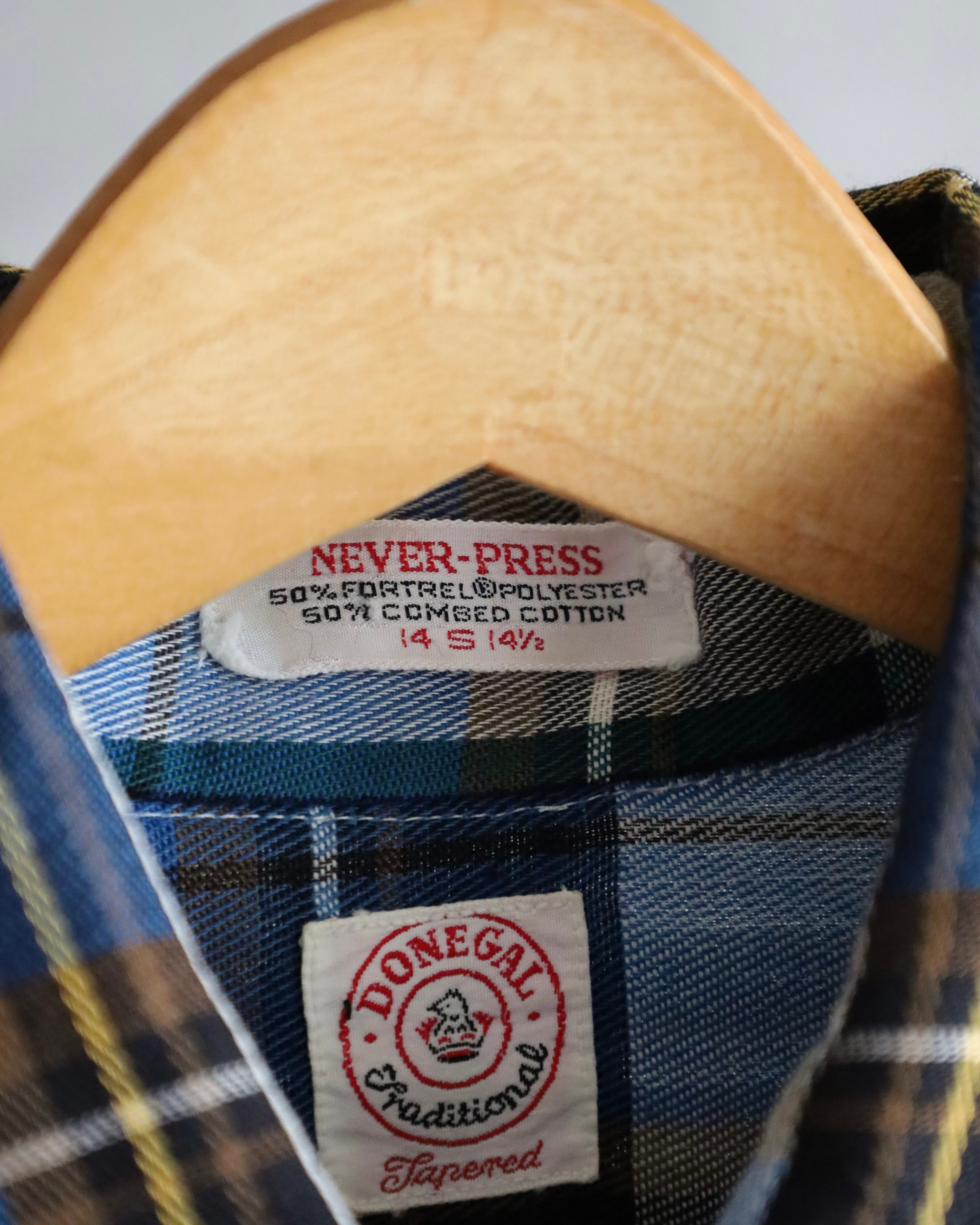 タグには「NEVER-PRESS」の表記があり、ポリエステルとコットンの混紡素材によるシワになりにくい仕様。当時らしいイージーケアを意識した作りで、軽くさらっとした生地感が特徴です。一枚着としてはもちろん、ジャケットやスウェットのインナーにも取り入れやすいシャツです。