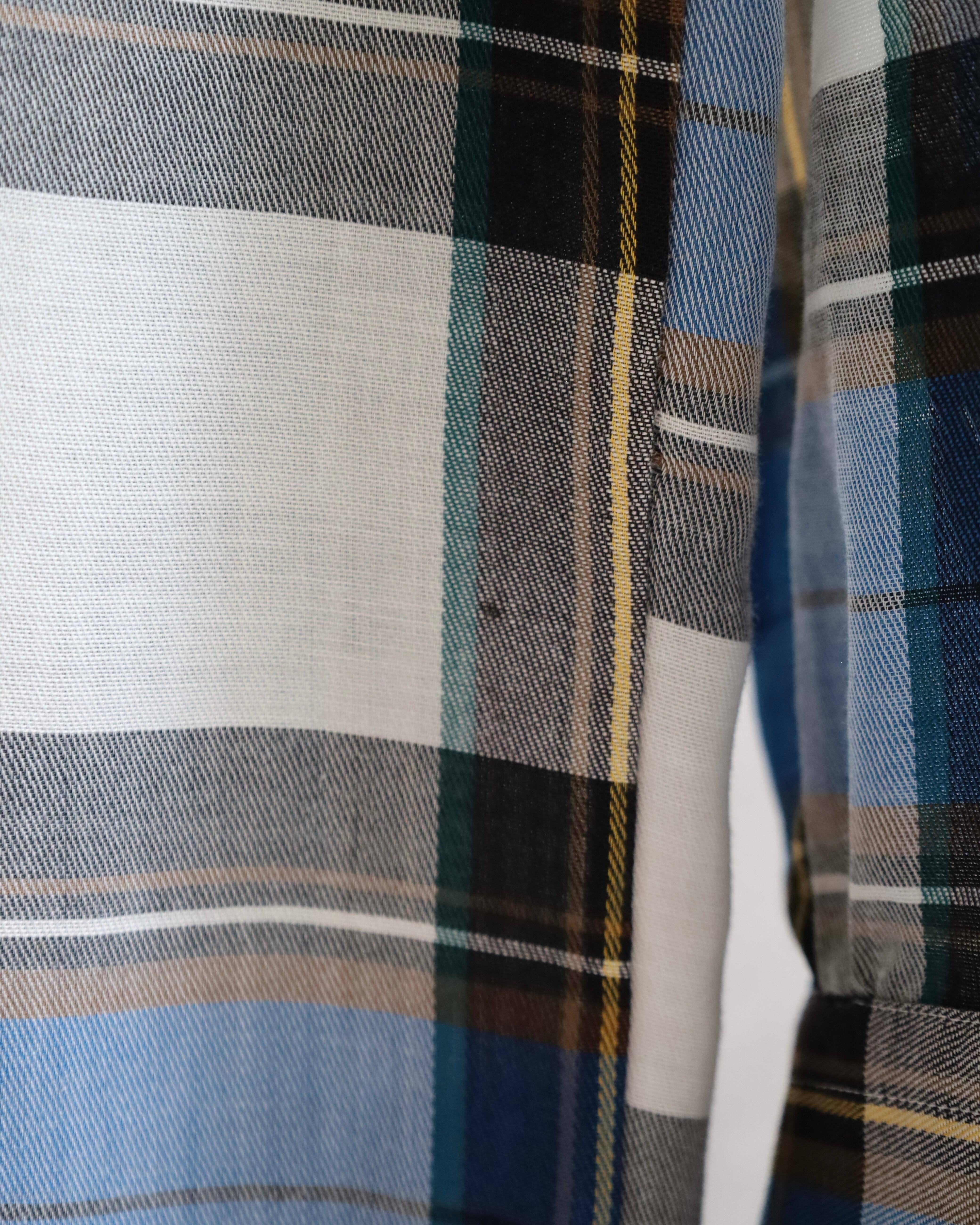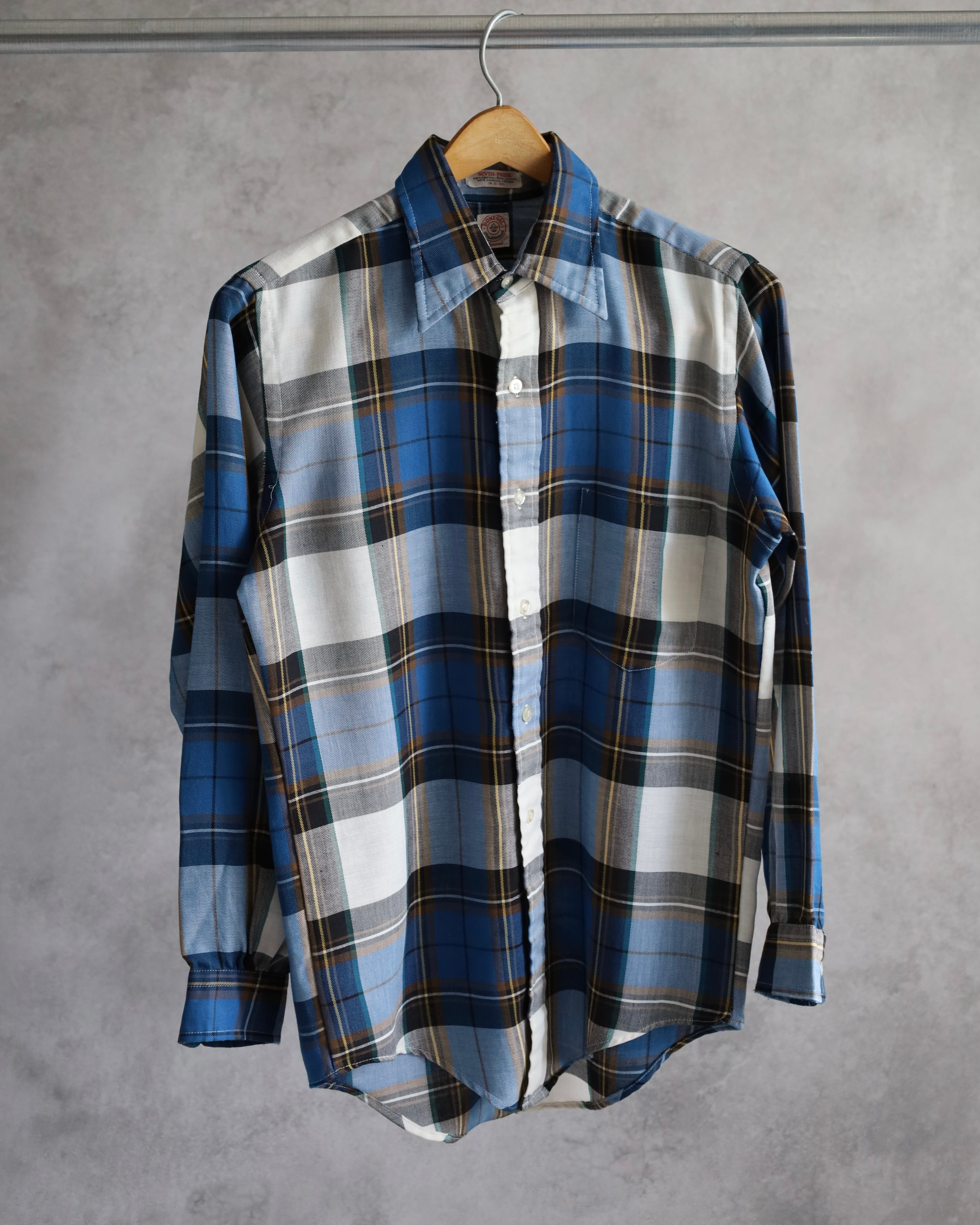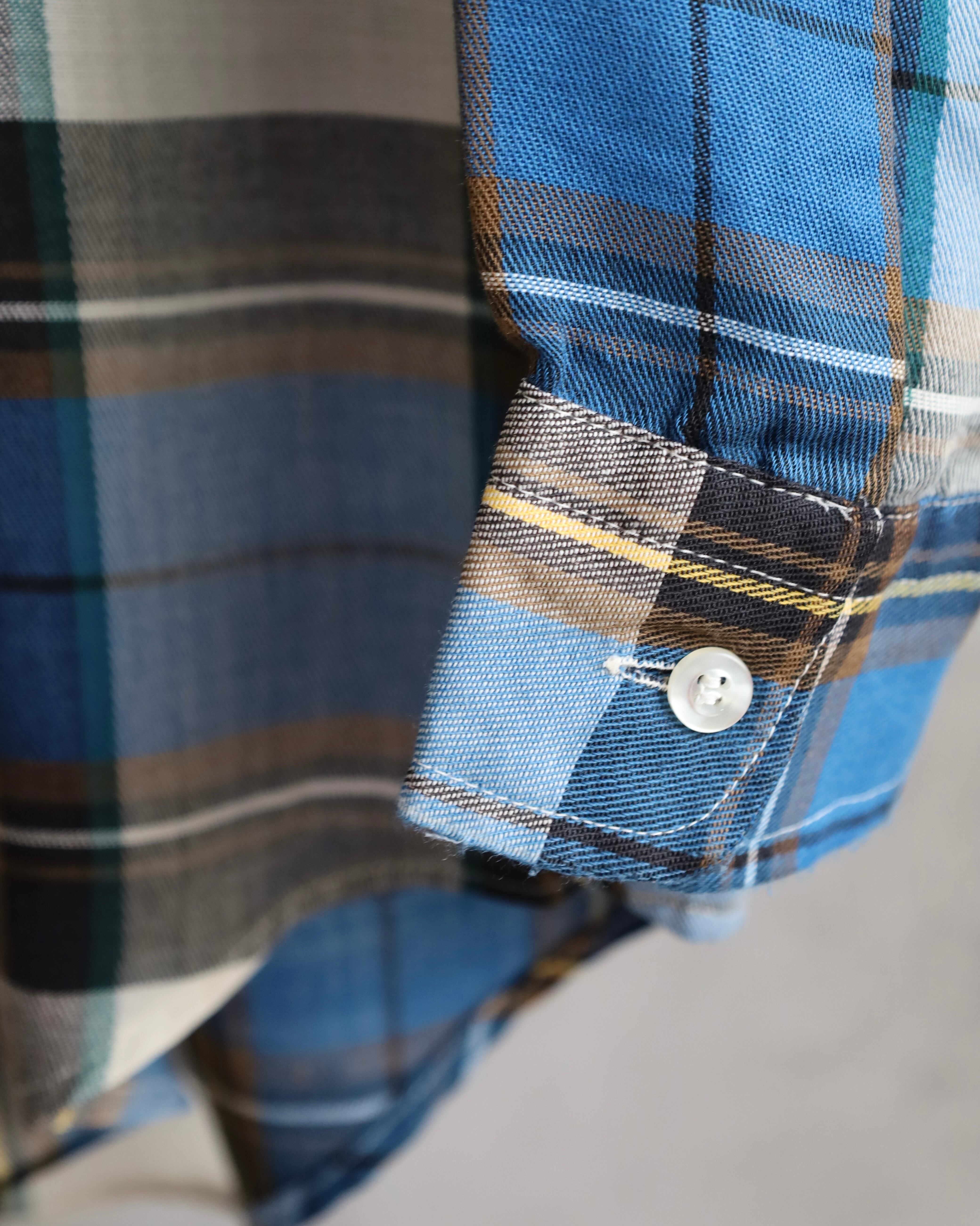 ブルーを基調としたチェックパターンが印象的な一枚。落ち着いた配色ながら、程よく主張のある柄使いで、アメリカンカジュアルらしい雰囲気を感じさせます。レギュラーカラー仕様で、年代問わず着用しやすいベーシックなデザインです。