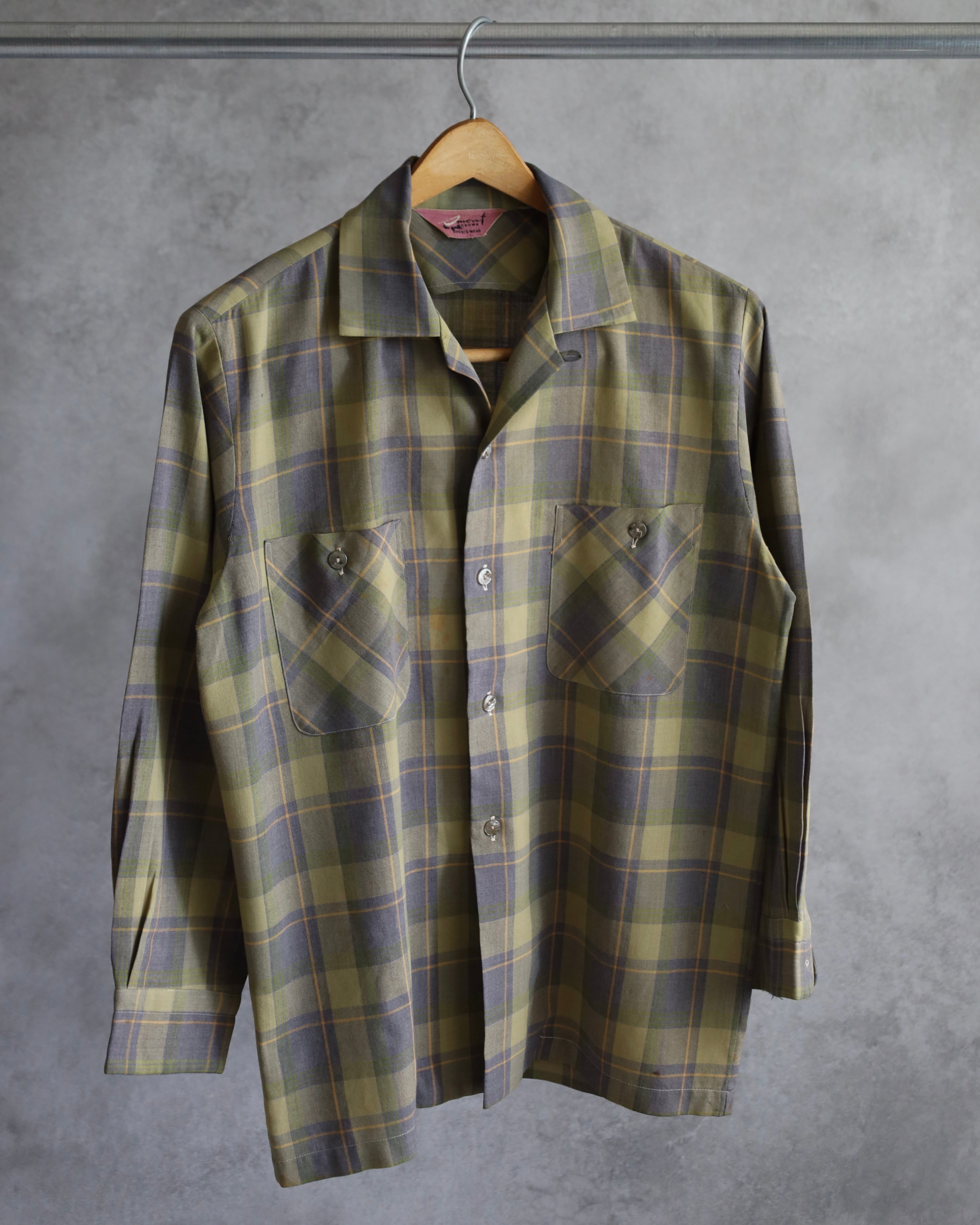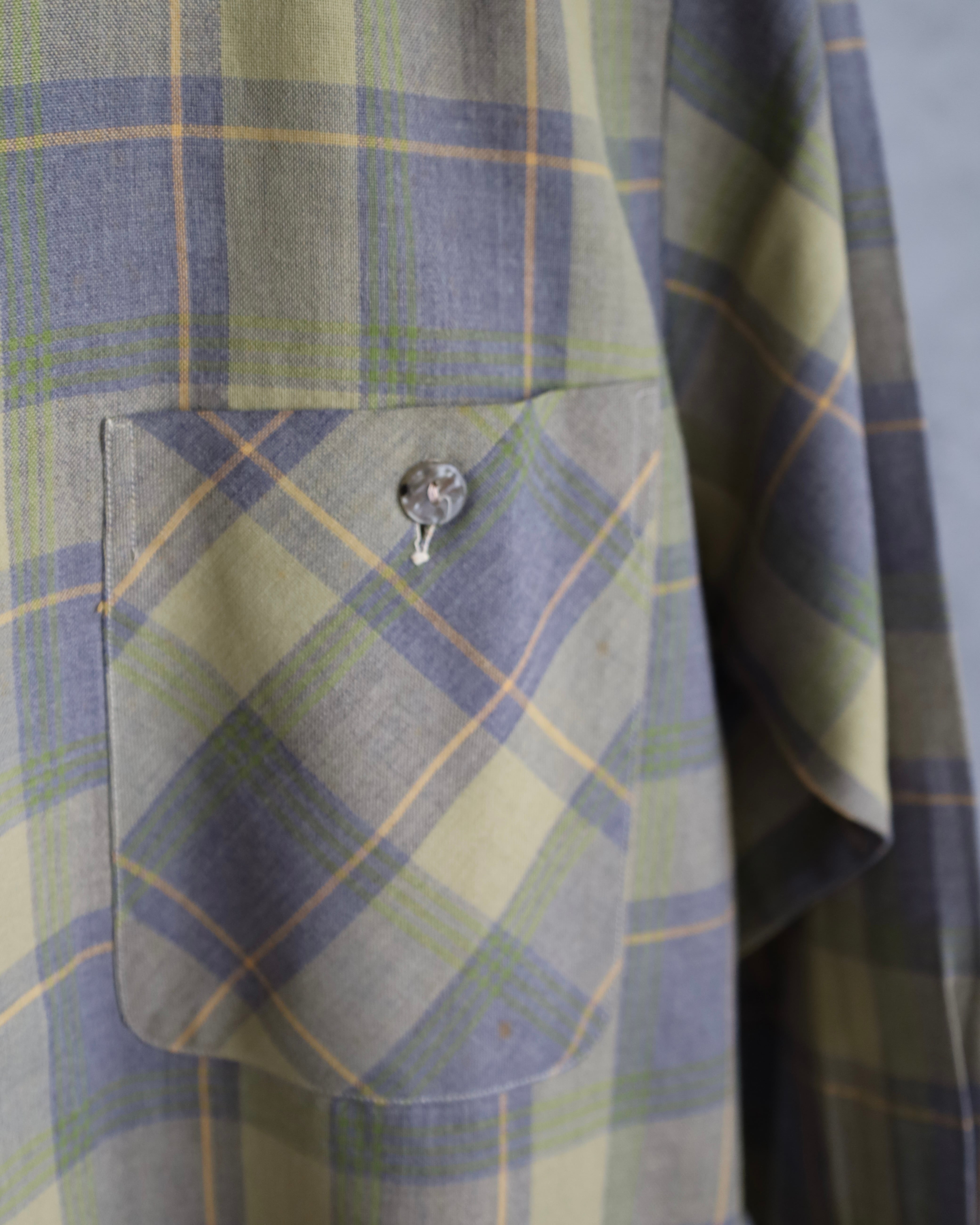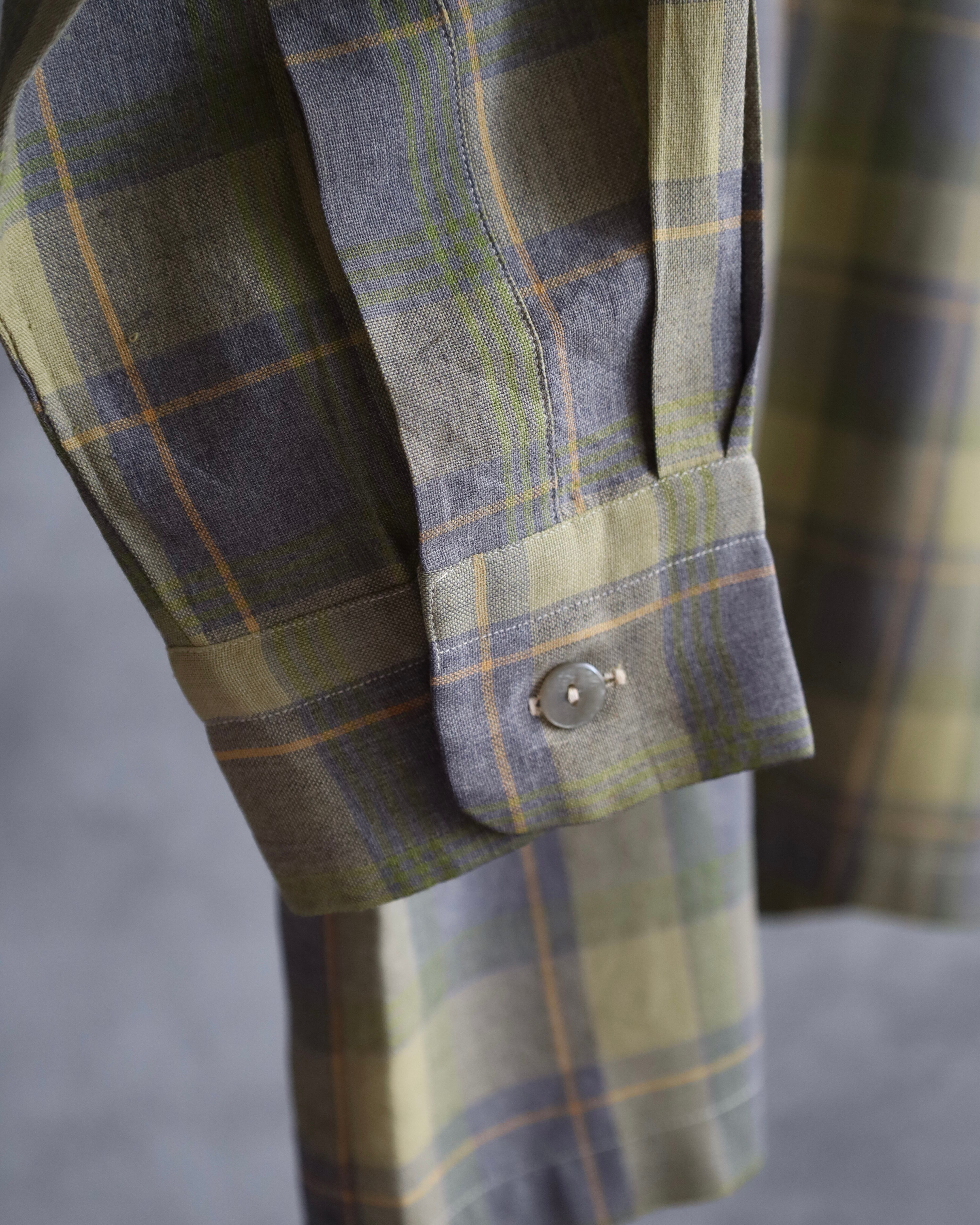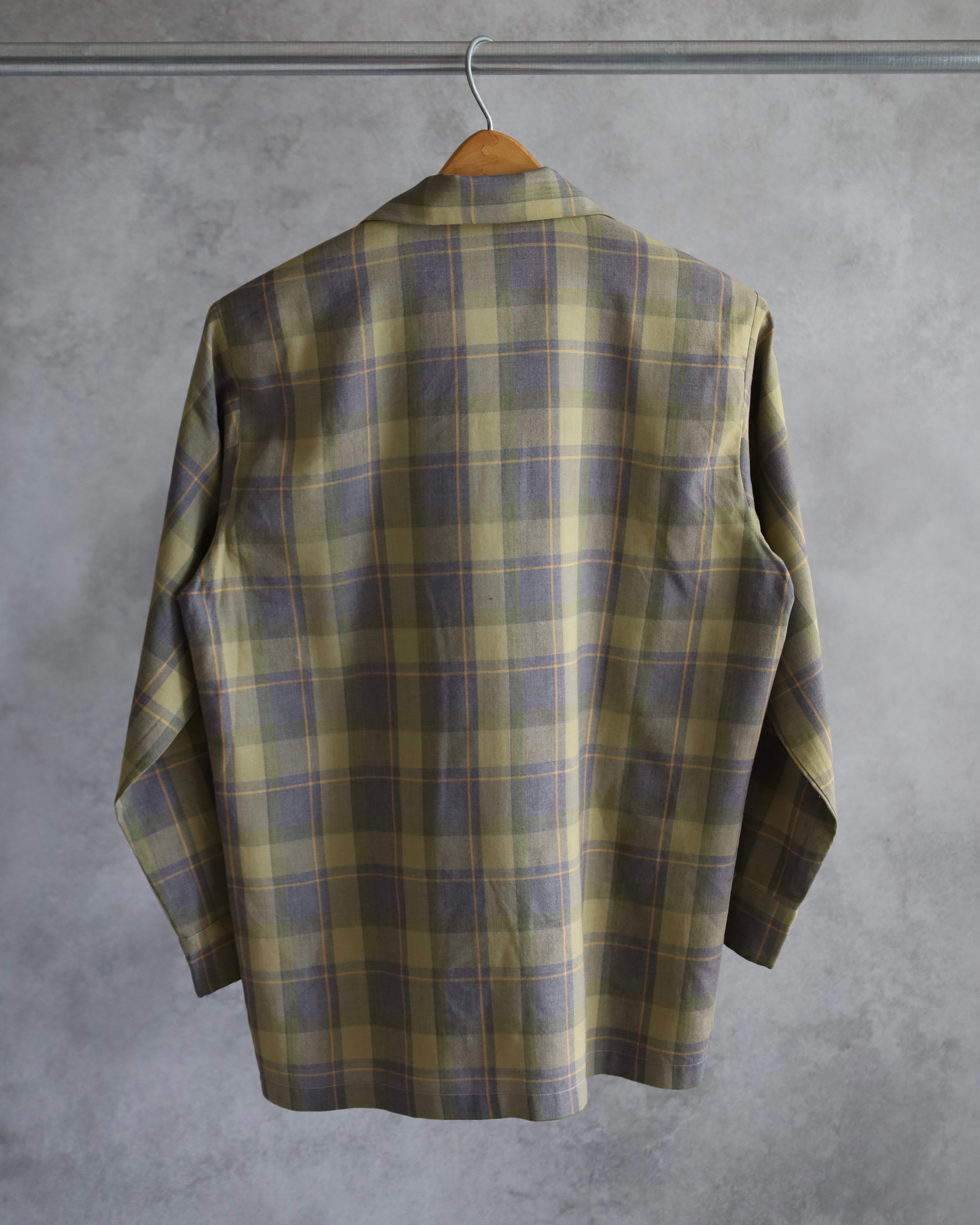 グリーンをベースに、グレーやイエローのラインが入る落ち着いたチェックパターンの一枚。派手さはなく、渋い配色でヴィンテージらしい雰囲気を感じさせます。襟はオープンカラー仕様で、リラックス感のあるクラシックなデザイン。