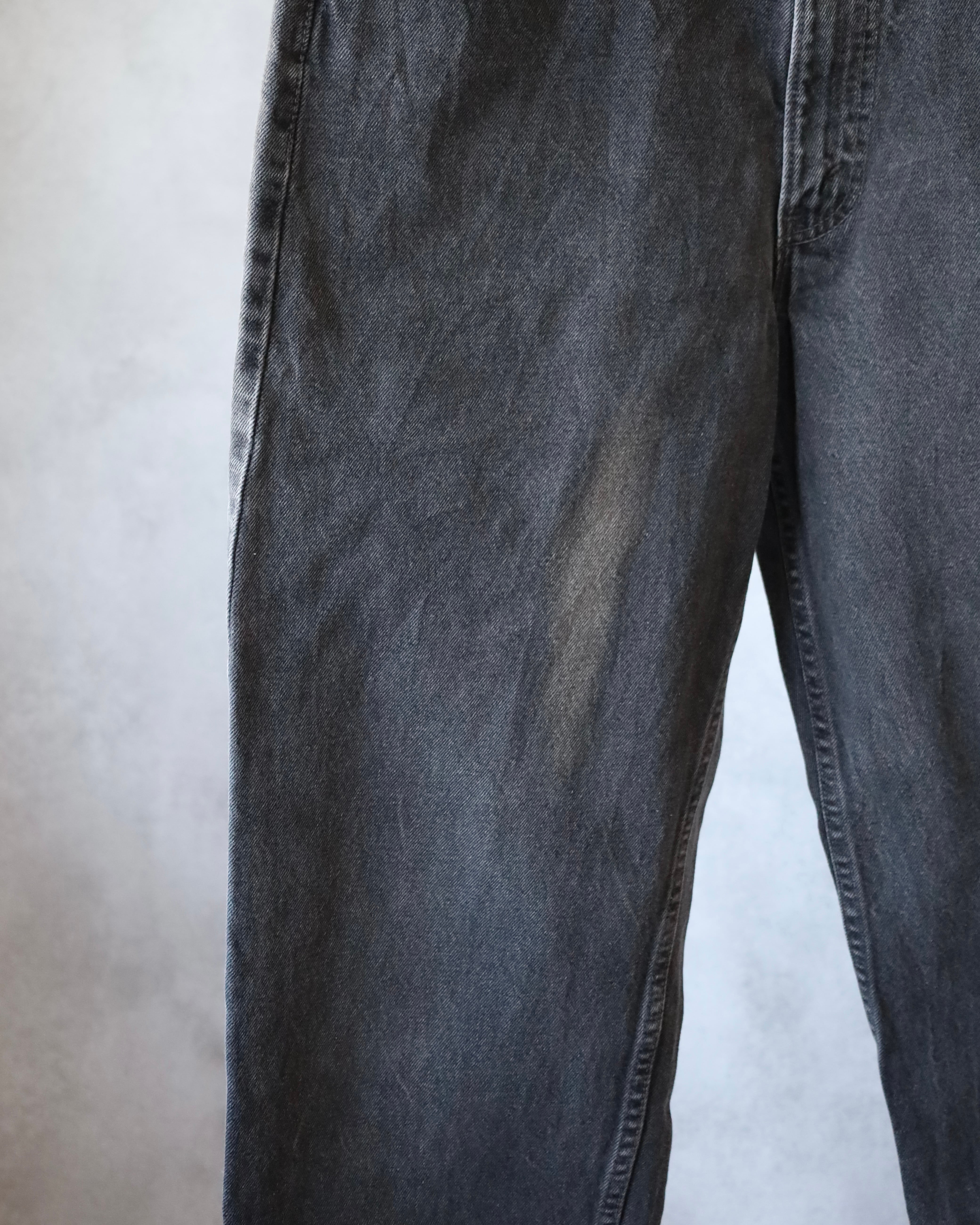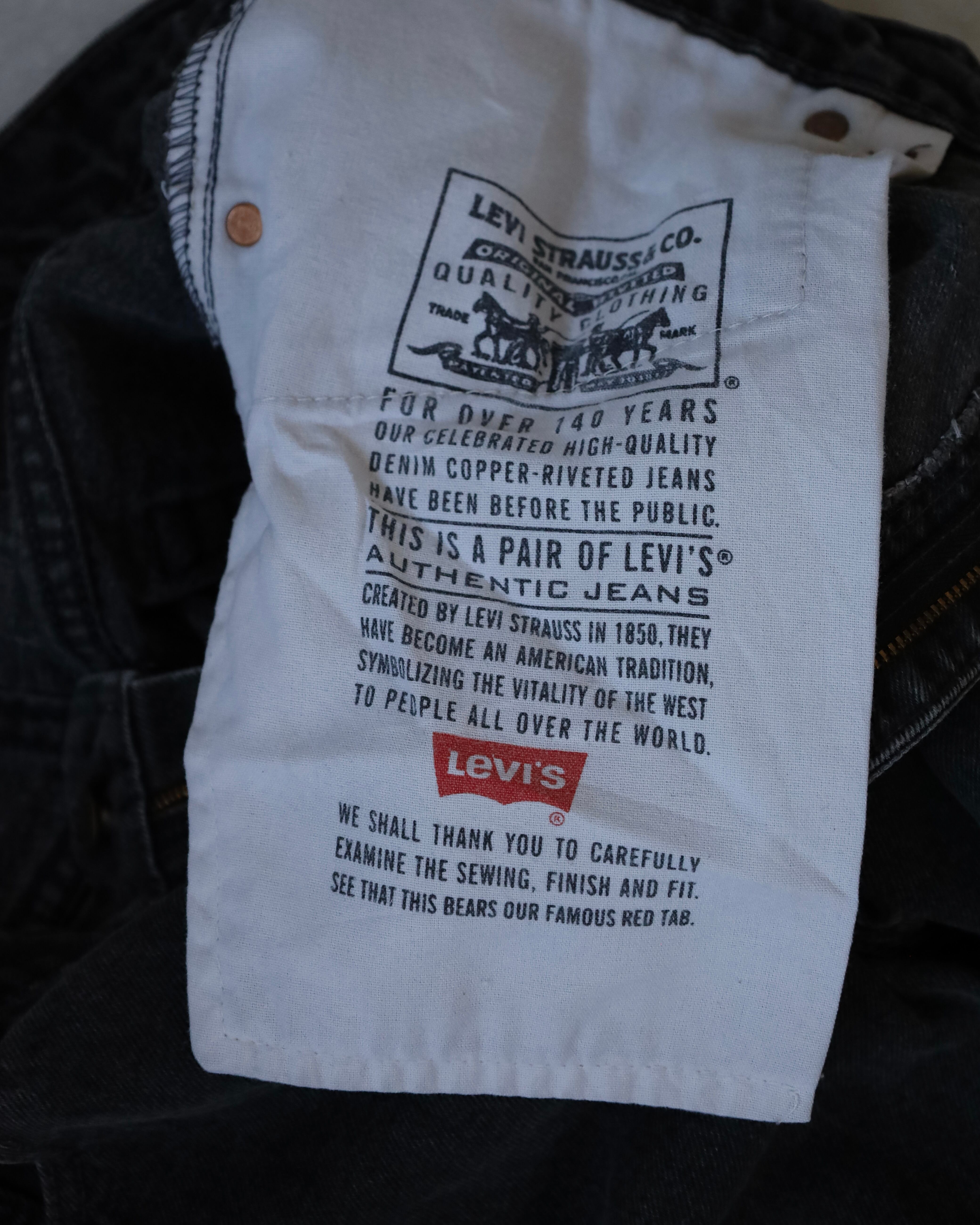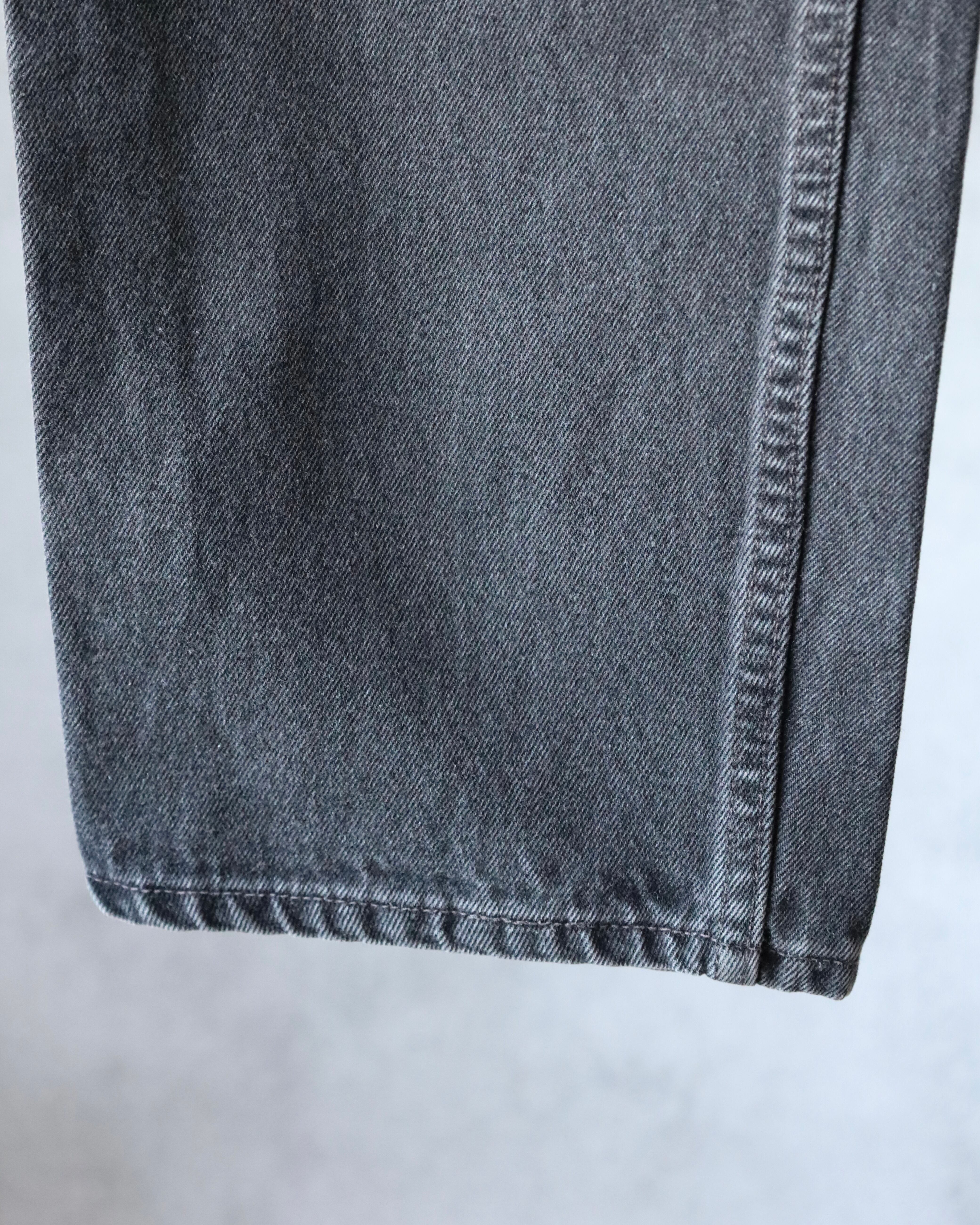Levi’sの定番モデル「550」。ヒップから腿にかけてゆとりのあるRELAXED FITで、テーパードの効いたシルエットが特徴です。カラーはブラックデニムで、全体にフェードが入り、味のある色落ちとアタリが見られます。