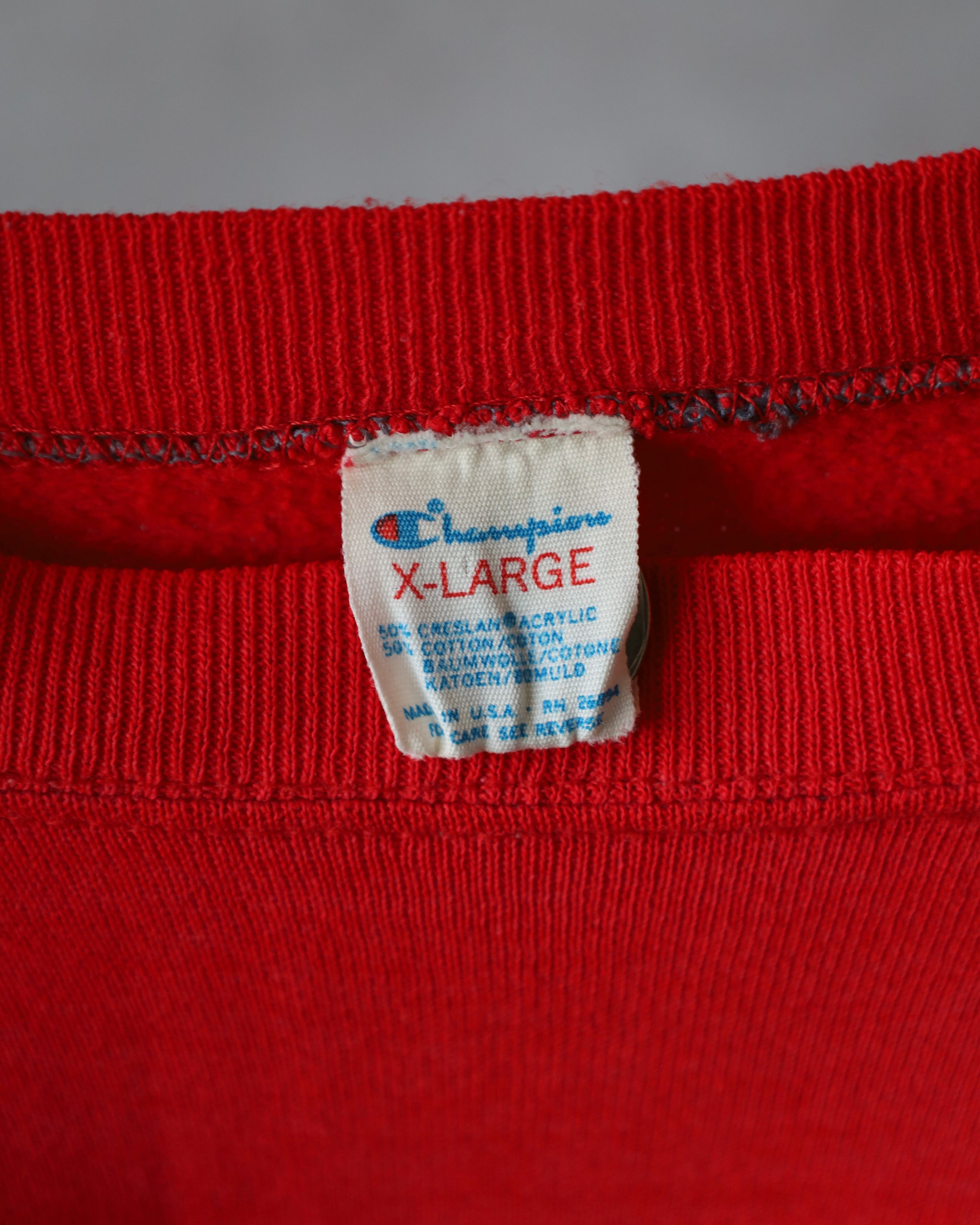 発色の強いレッドボディはこの年代特有の色味で、フェードもまだ浅くコンディション良好。ラグランスリーブで肩の落ち方も自然、サイズX-LARGEでしっかりゆとりのあるシルエットです。