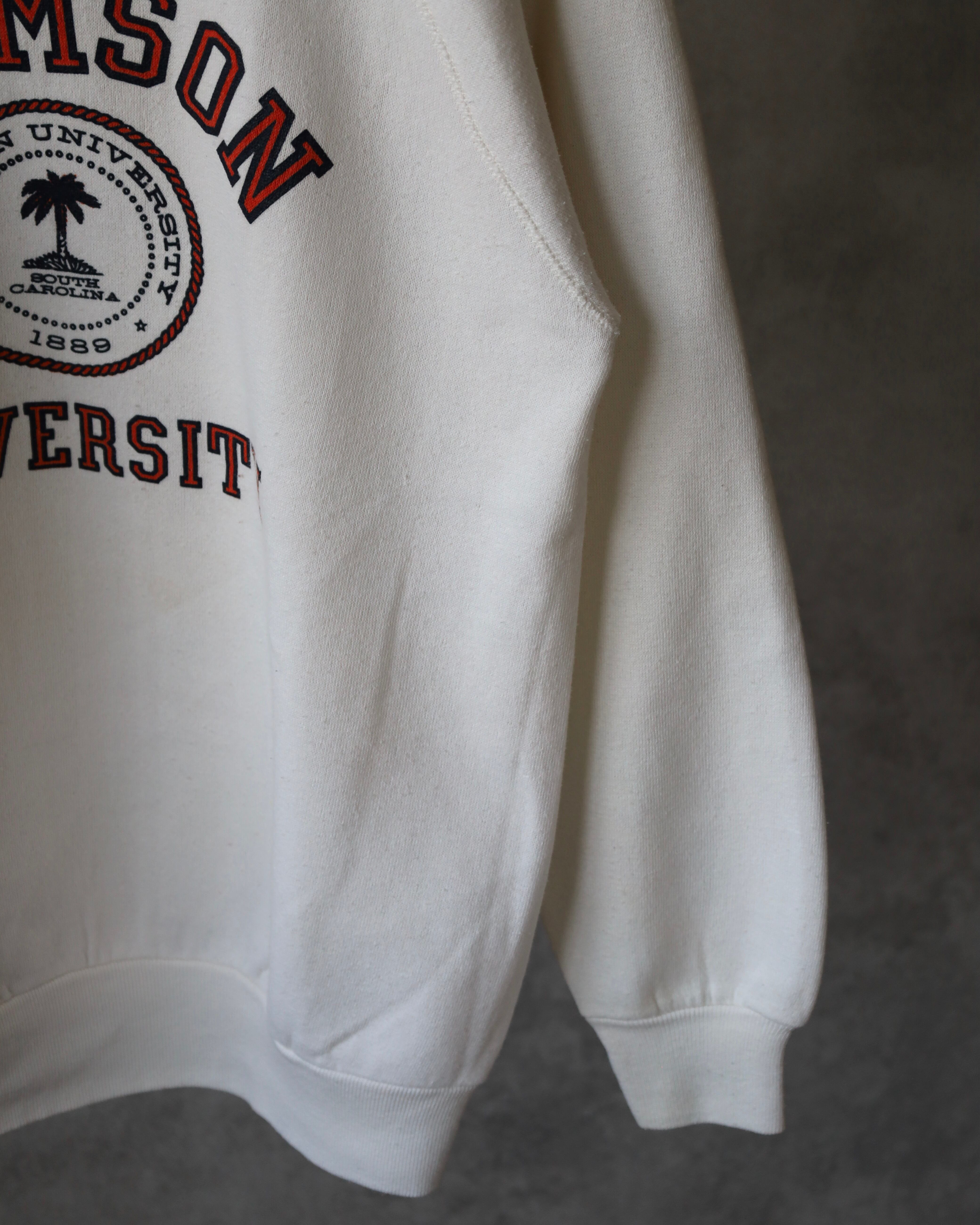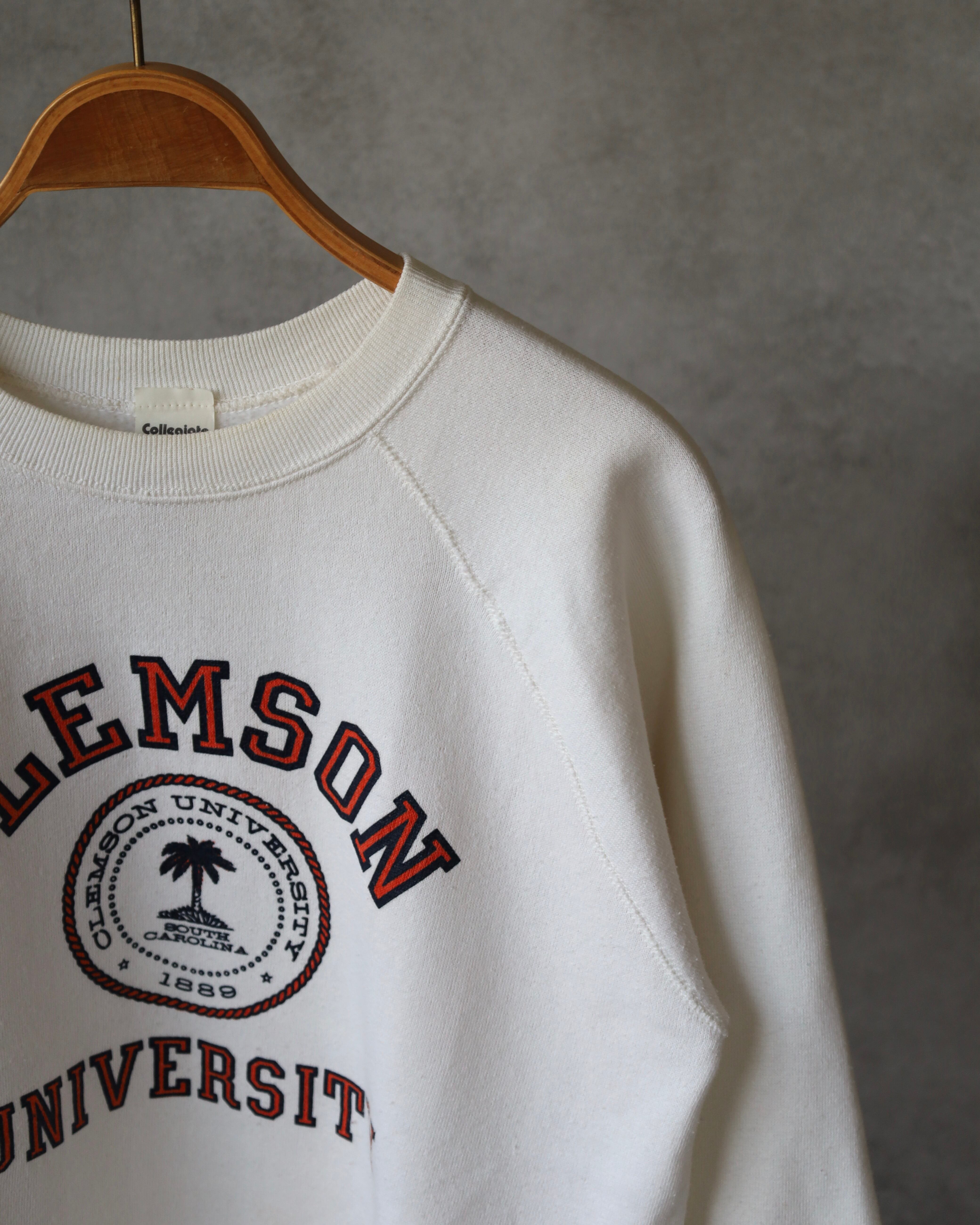 オフホワイトボディに「CLEMSON」アーチロゴ、その下に大学エンブレム、「UNIVERSITY」の二段構成プリント。ネイビー×オレンジの配色で、王道カレッジデザイン。