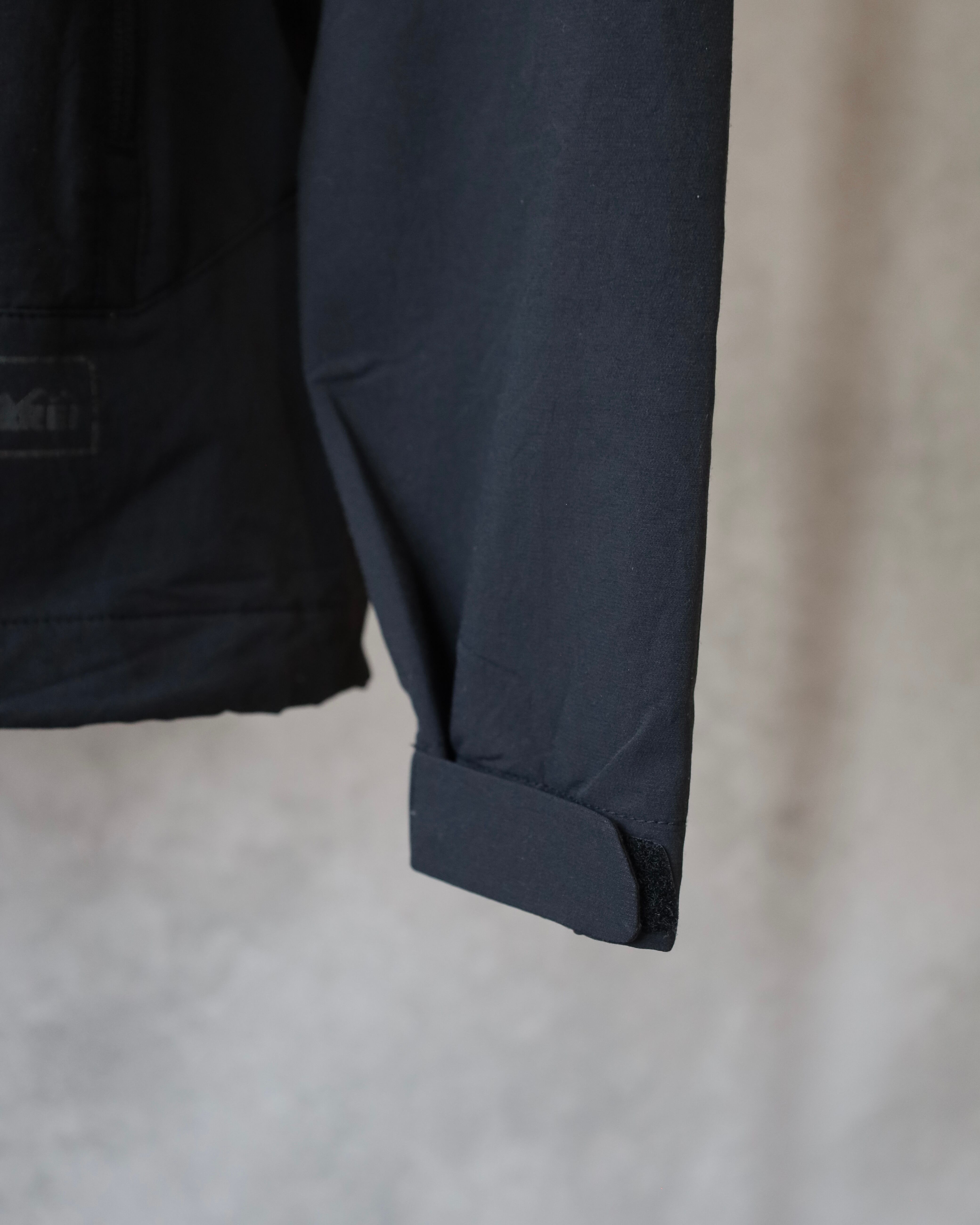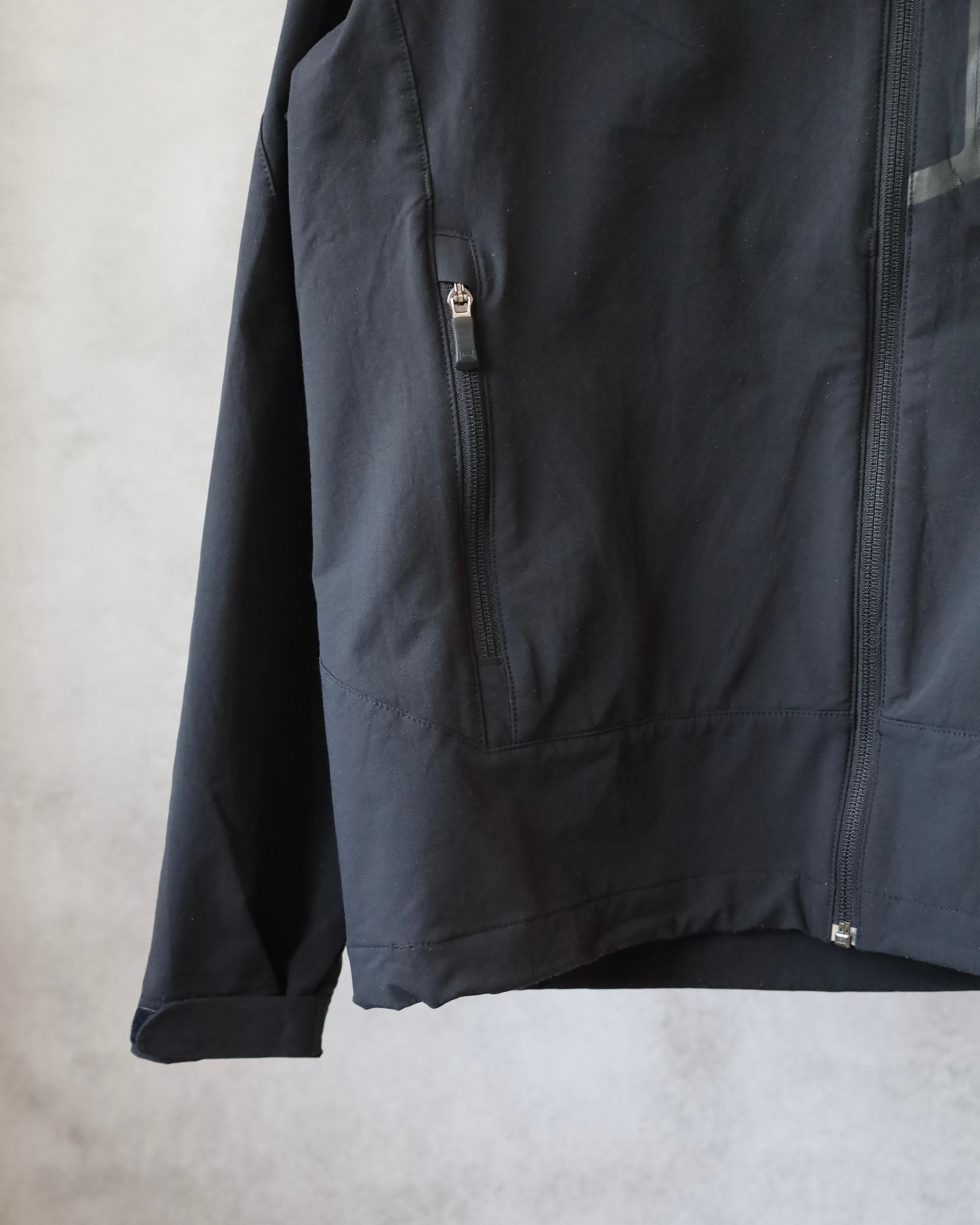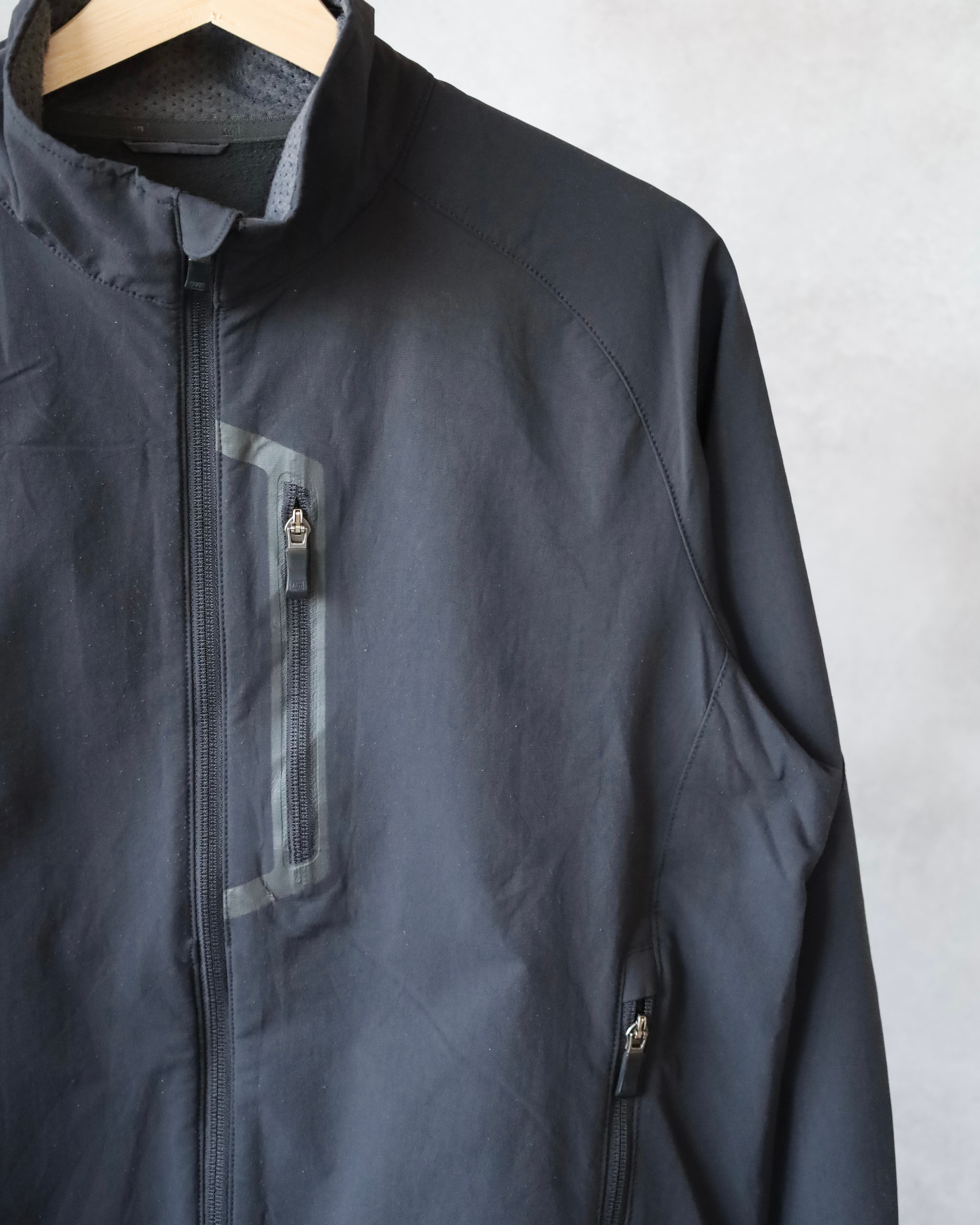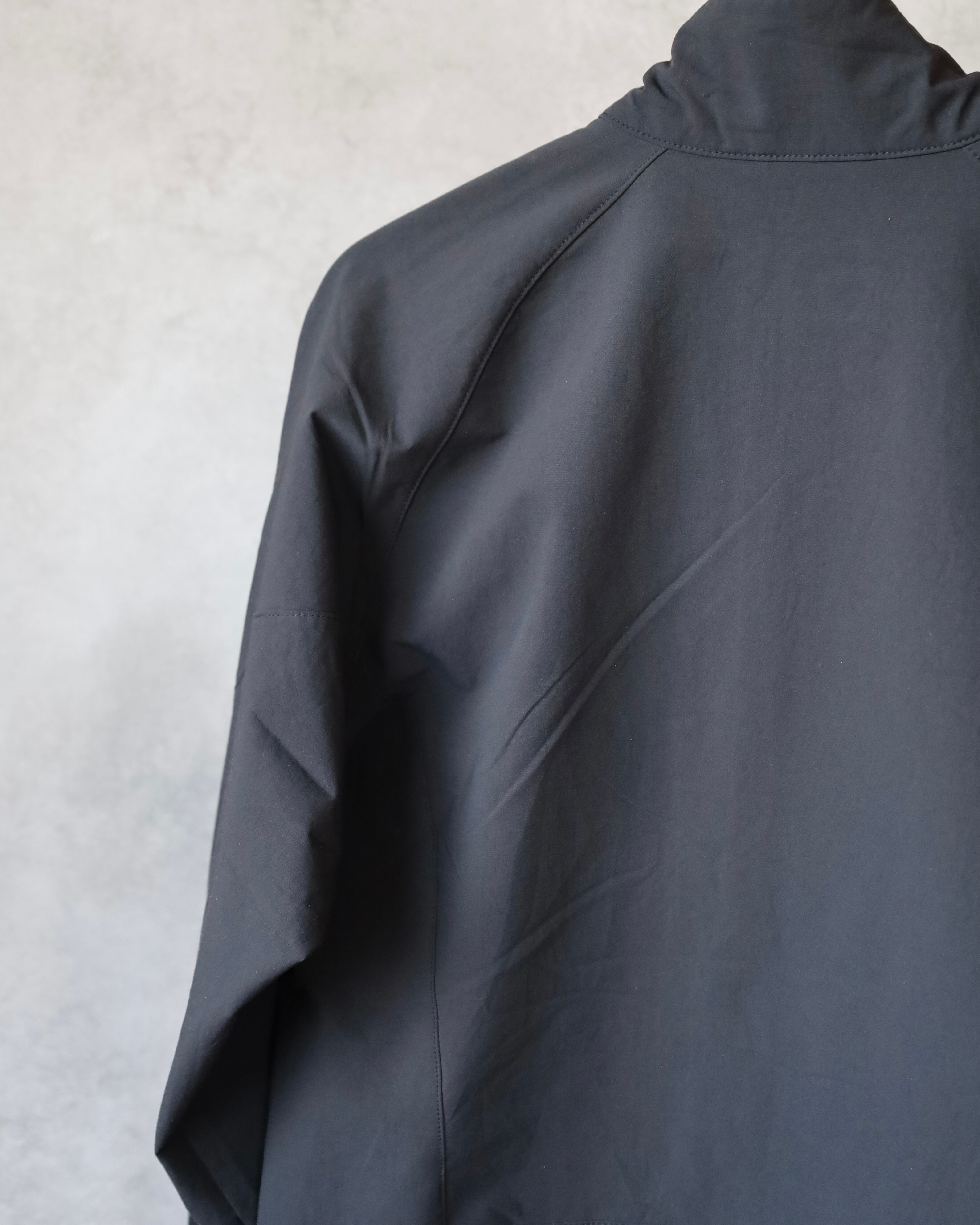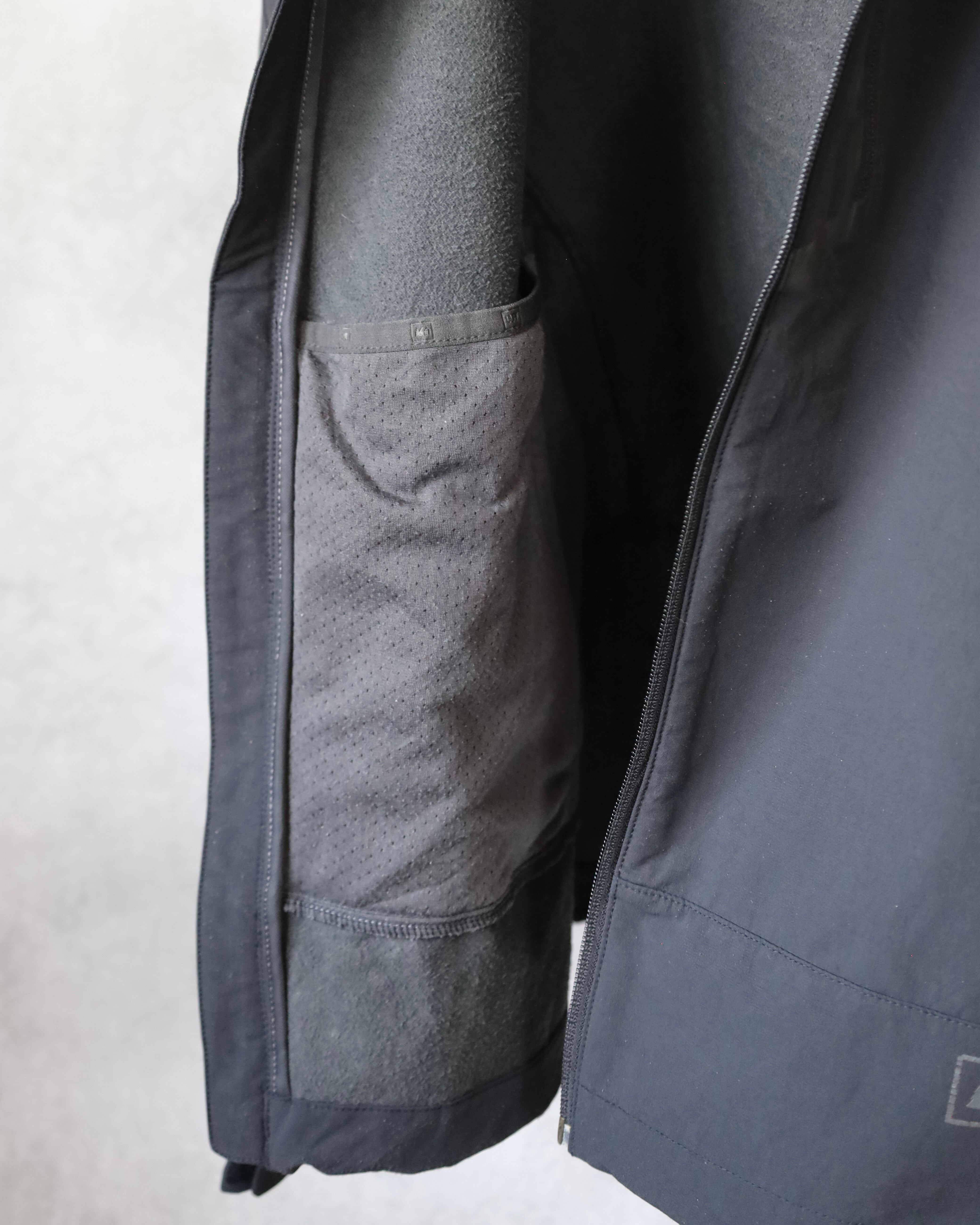 こちらはミニマルなブラックカラーに、止水ジップ仕様の胸ポケットが映える1着。
