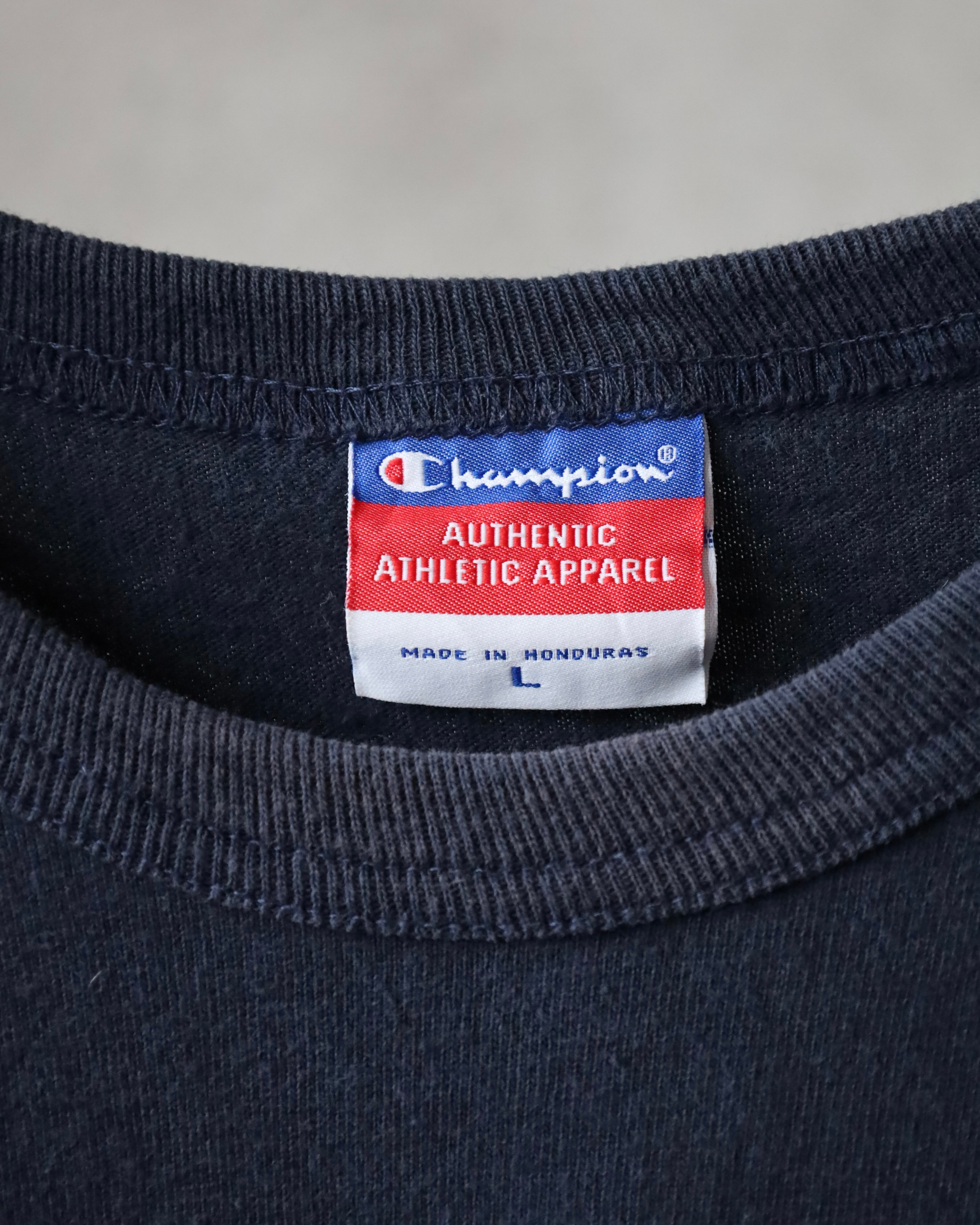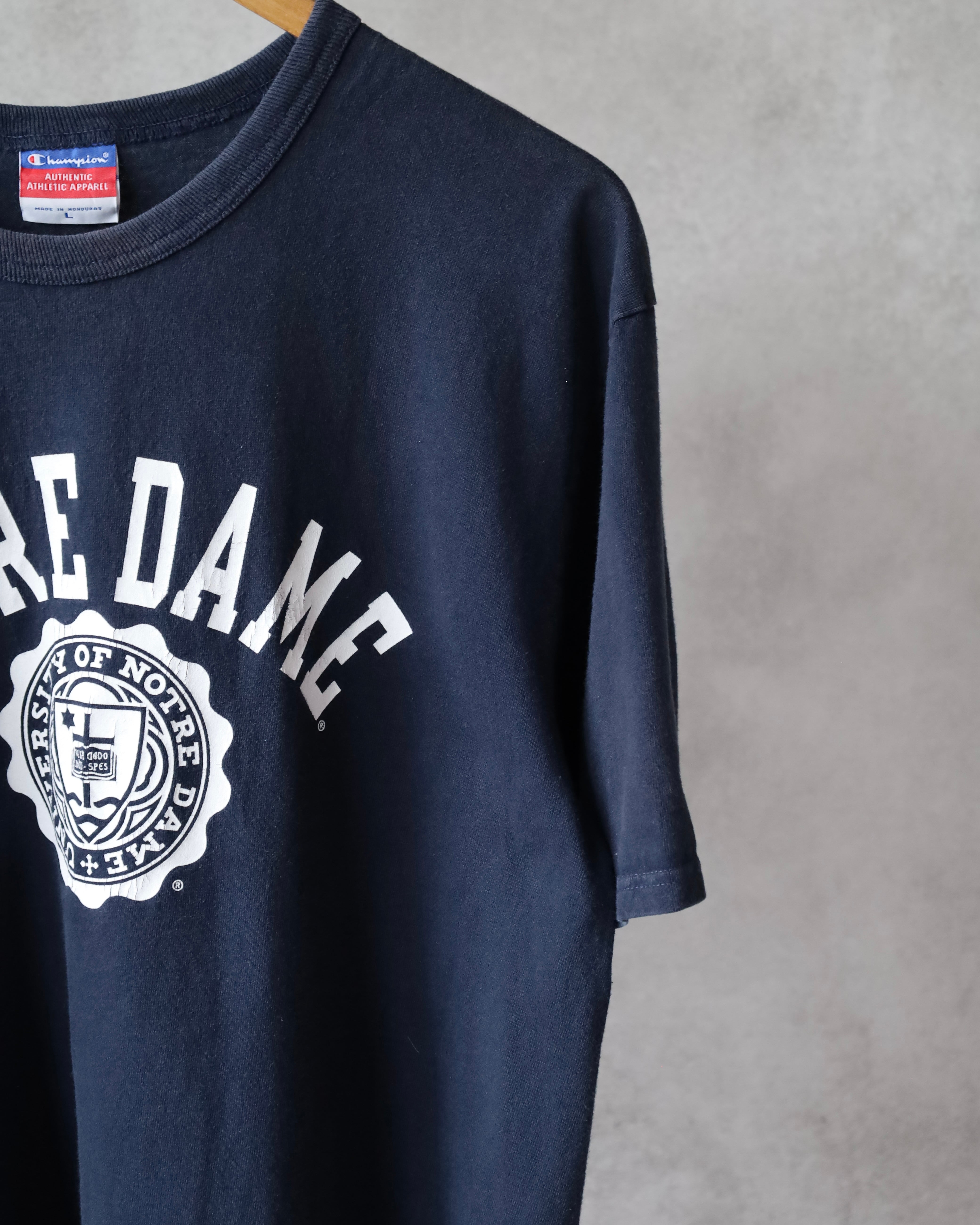 Championボディに、NOTRE DAMEのアーチロゴと紋章プリントが入るカレッジTです。