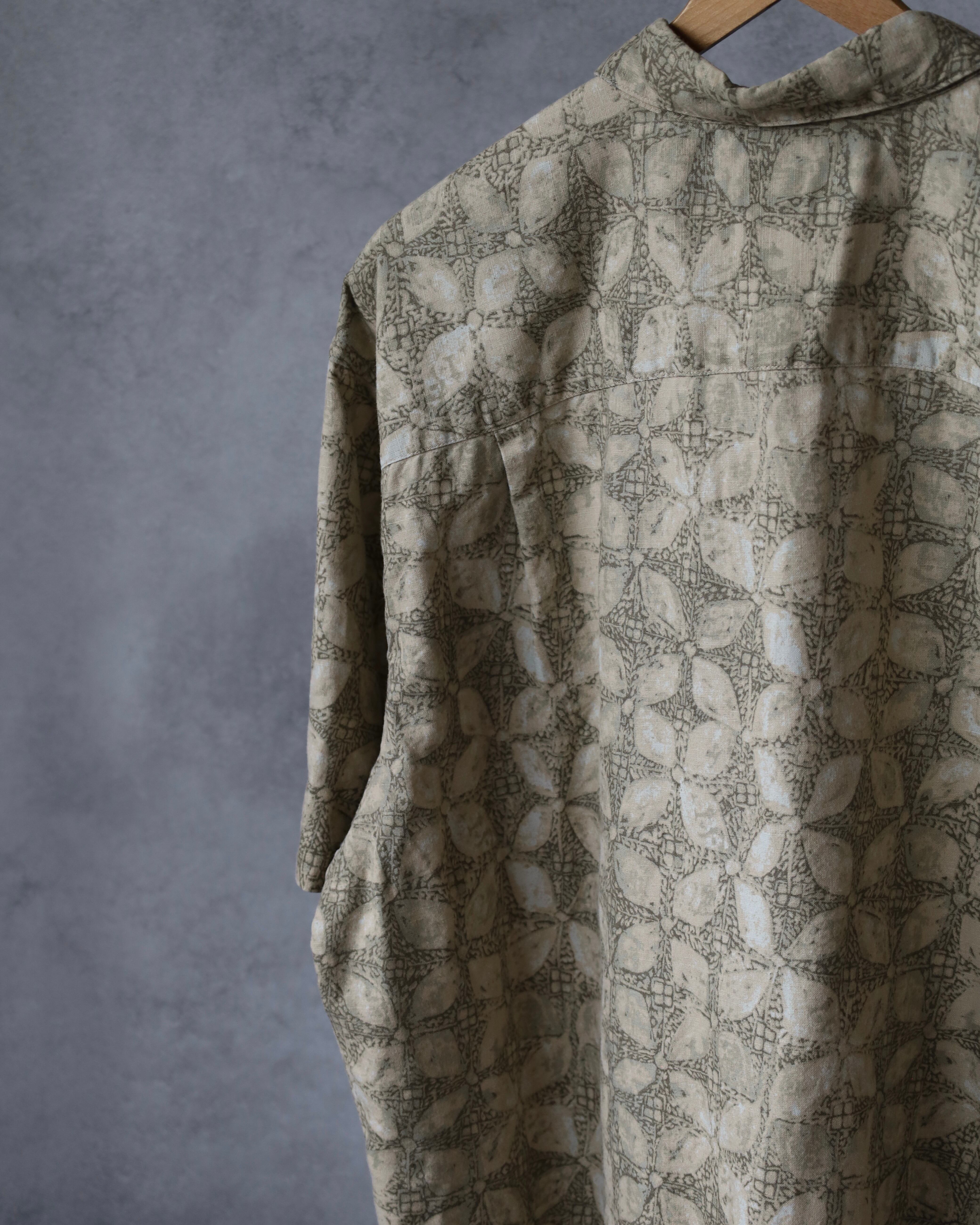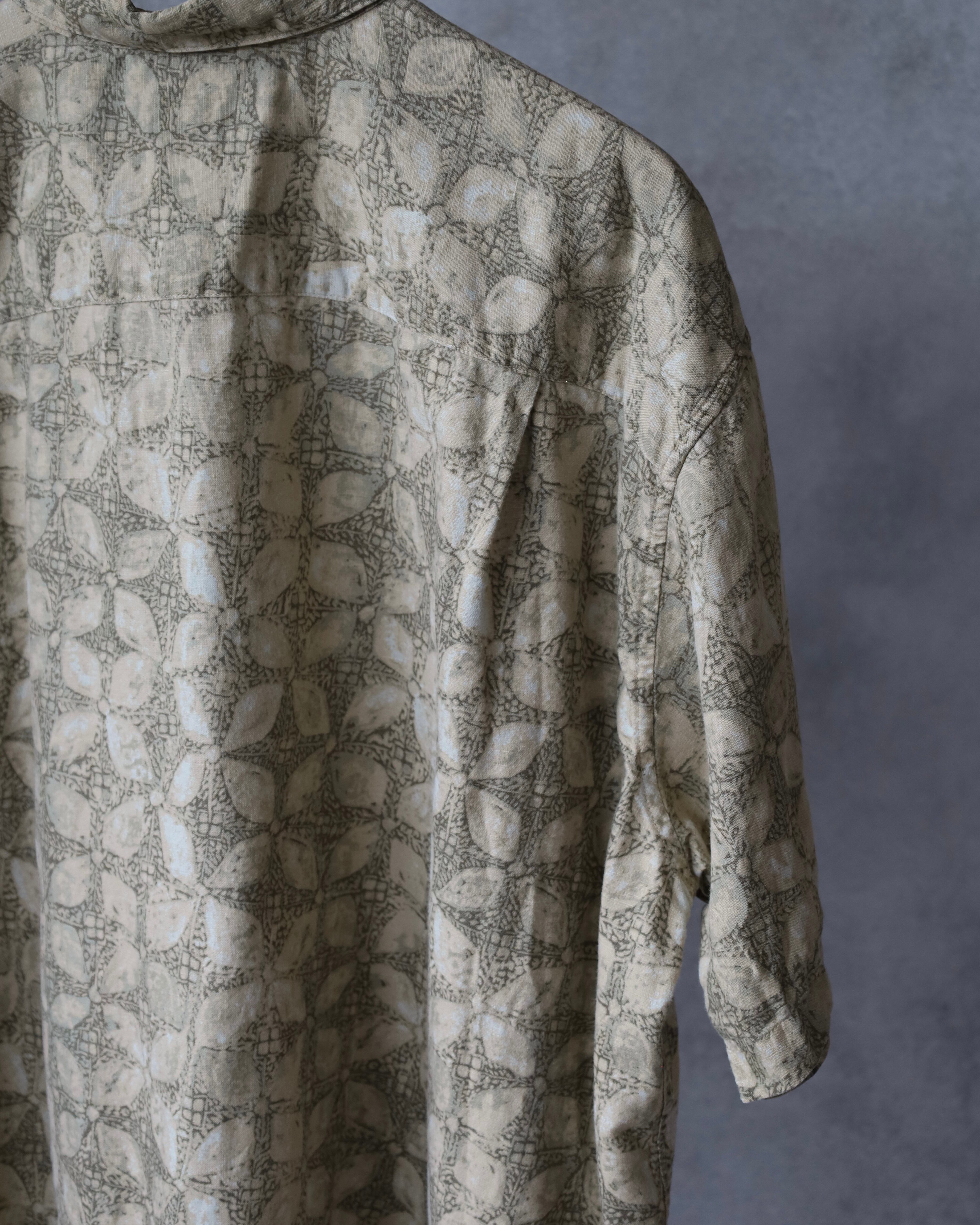 ベージュ系の落ち着いた色味に、花のようにも見える幾何学調の総柄が入ることで、柄物でも主張がきつくなりすぎず、さらっと合わせやすい一着です。